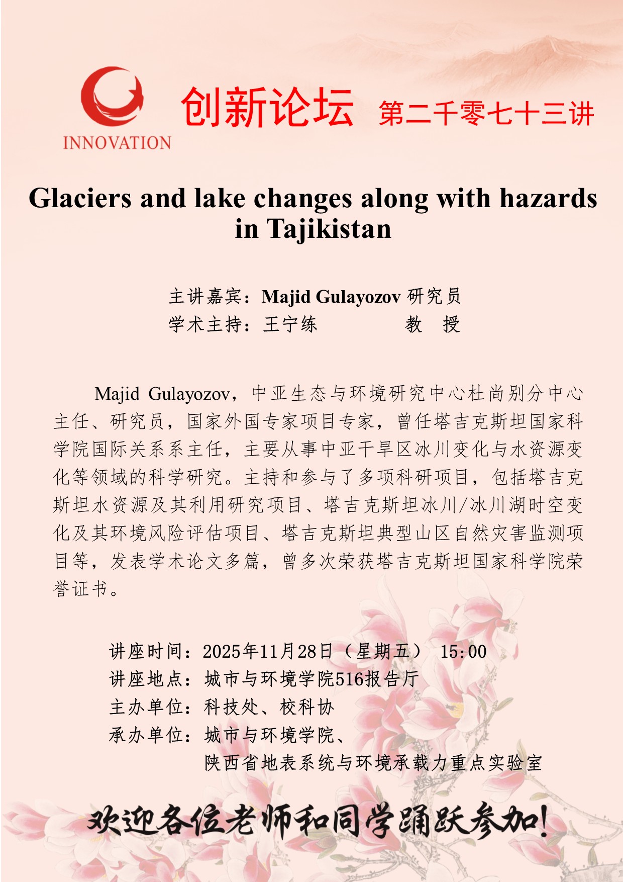 Majid Gulayozov 研究员 西北大学创新论坛第二千零七十三讲:Glaciers and lake changes along with hazards in Tajikistan 讲座时间 2025年11月28日(星期五) 15:00 讲座地点 城市与环境学院516报告厅 讲座人介绍 Majid Gulayozov 研究员 讲座内容