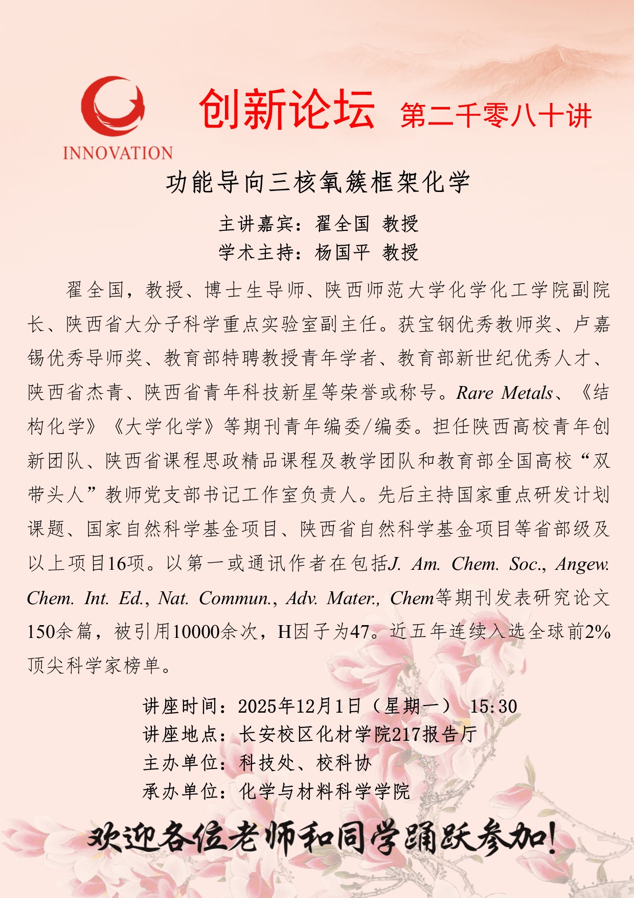 西北大学创新论坛第二千零八十讲:功能导向三核氧簇框架化学