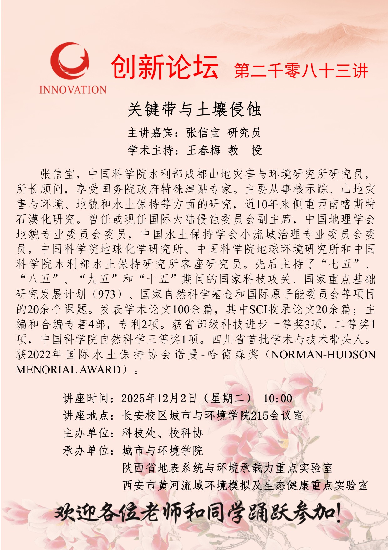 张信宝 研究员 西北大学创新论坛第二千零八十三讲:关键带与土壤侵蚀 讲座时间 2025年12月02日(星期二) 10:00 讲座地点 长安校区城市与环境学院215会议室 讲座人介绍 张信宝 研究员 讲座内容