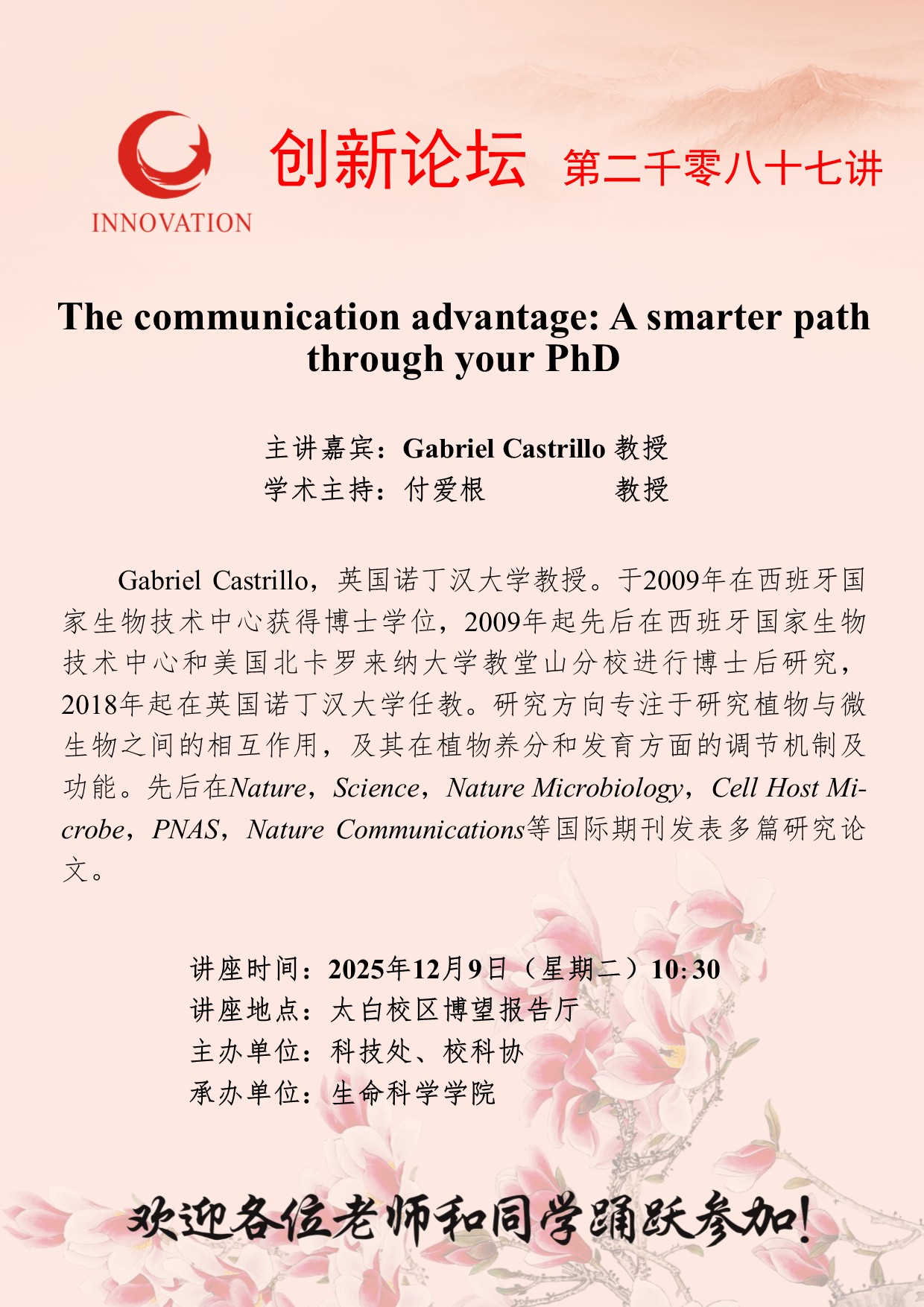 Gabriel Castrillo 教授 西北大学创新论坛第二千零八十七讲:The communication advantage: A smarter path through your PhD 讲座时间 2025年12月9日(星期二)10:30 讲座地点 太白校区博望报告厅 讲座人介绍 Gabriel Castrillo 教授 讲座内容