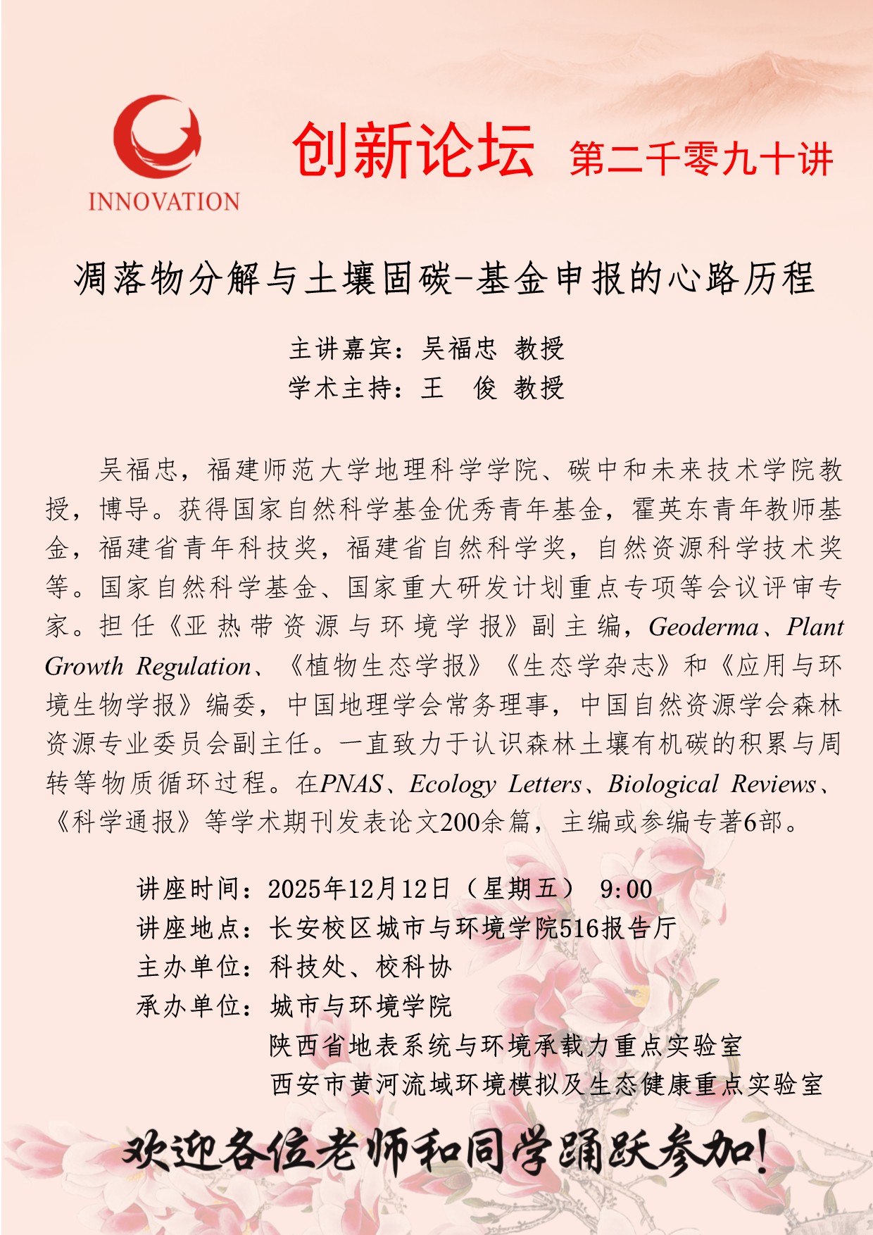 吴福忠 教授 西北大学创新论坛第二千零九十讲:凋落物分解与土壤固碳-基金申报的心路历程 讲座时间 2025年12月12日(星期五) 9:00 讲座地点 长安校区城市与环境学院516报告厅 讲座人介绍 吴福忠 教授 讲座内容