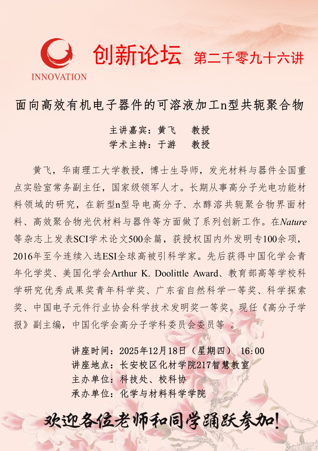 黄飞 教授 西北大学创新论坛第二千零九十六讲:面向高效有机电子器件的可溶液加工n型共轭聚合物 讲座时间 2025年12月18日(星期四) 16:00 讲座地点 长安校区化材学院217智慧教室 讲座人介绍 黄飞 教授 讲座内容