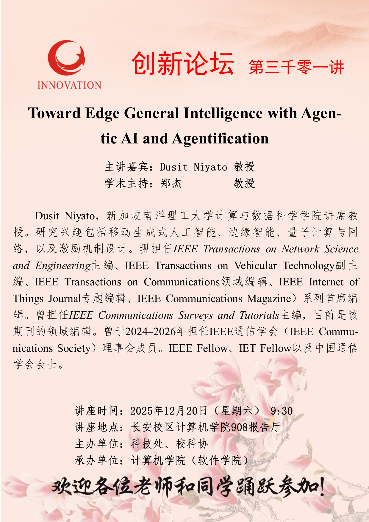 Dusit Niyato 教授 西北大学创新论坛第三千零一讲:Toward Edge General Intelligence with Agentic AI and Agentification 讲座时间 2025年12月20日(星期六) 9:30 讲座地点 长安校区计算机学院908报告厅 讲座人介绍 Dusit Niyato 教授 讲座内容