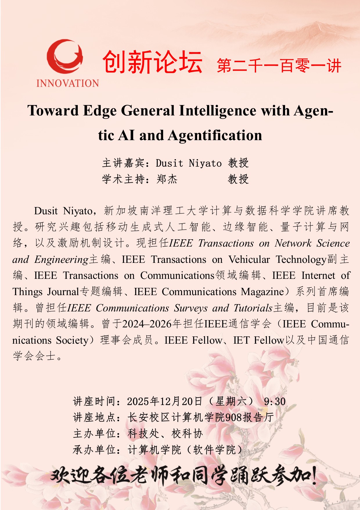 Dusit Niyato 教授 西北大学创新论坛第两千一百零一讲:Toward Edge General Intelligence with Agentic AI and Agentification 讲座时间 2025年12月20日(星期六) 9:30 讲座地点 长安校区计算机学院908报告厅 讲座人介绍 Dusit Niyato 教授 讲座内容