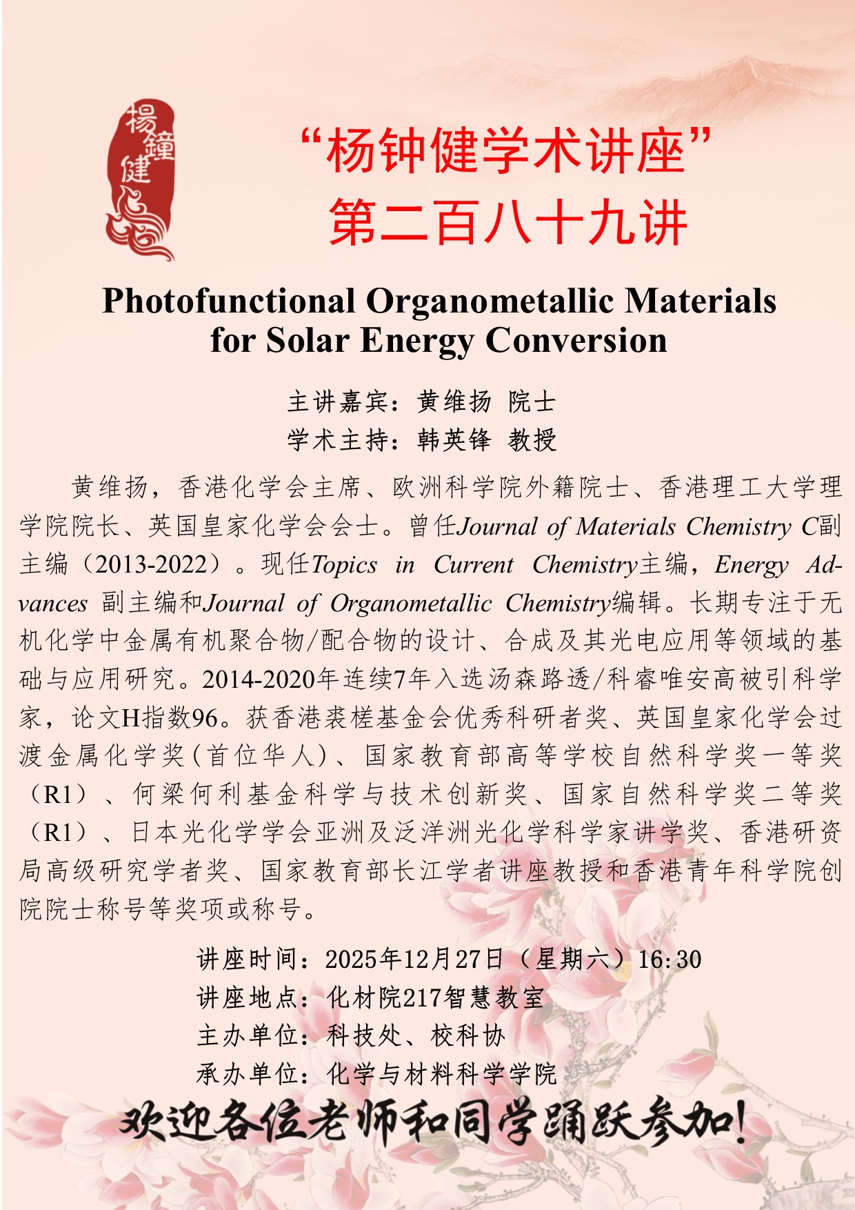 “杨钟健学术讲座”第二百八十九讲:Photofunctional Organometallic Materials for Solar Energy Conversion