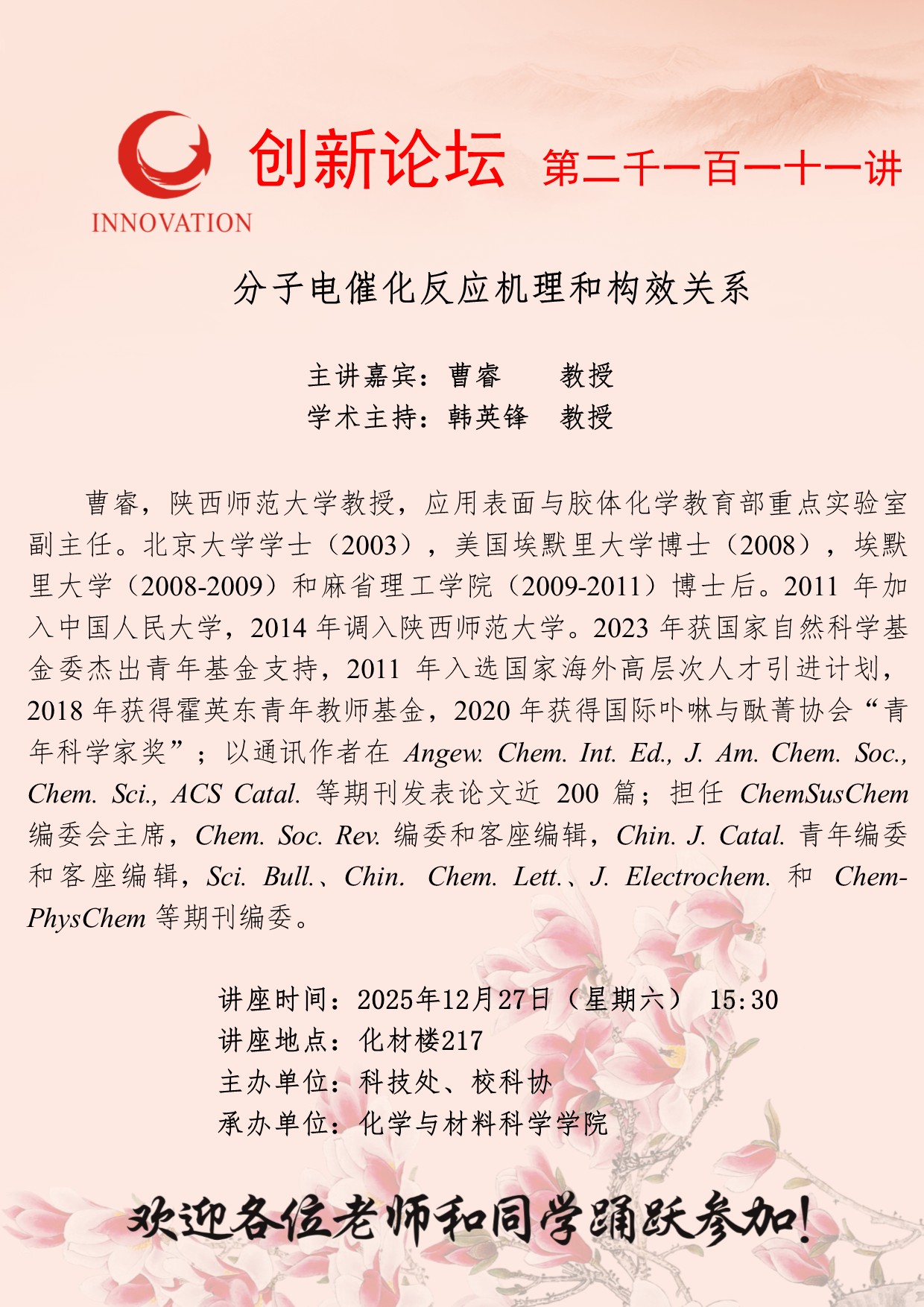 西北大学创新论坛第二千一百一十一讲:分子电催化反应机理和构效关系