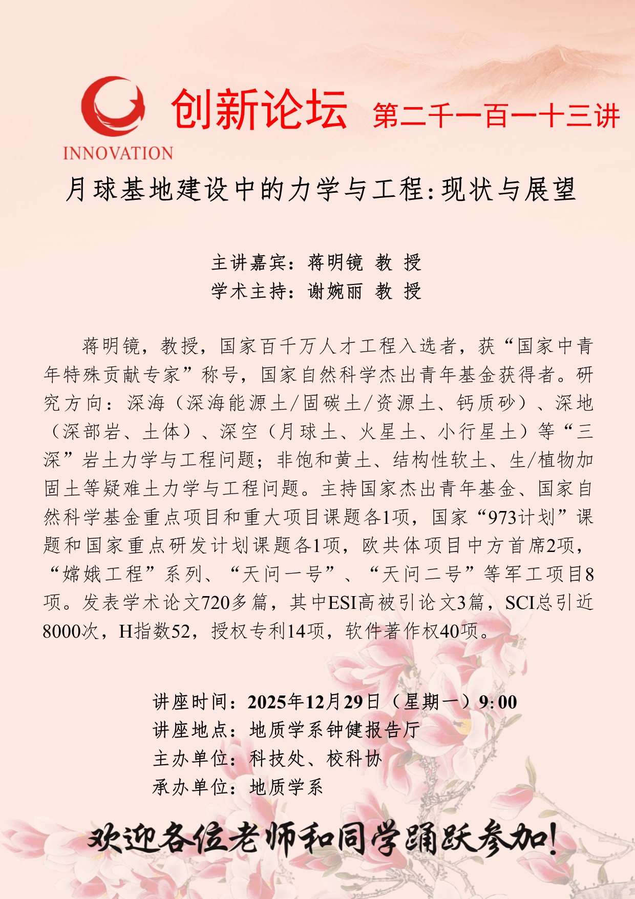 蒋明镜 教授 西北大学创新论坛第二千一百一十三讲:月球基地建设中的力学与工程:现状与展望 讲座时间 2025年12月29日(星期一)9:00 讲座地点 地质学系钟健报告厅 讲座人介绍 蒋明镜 教授 讲座内容