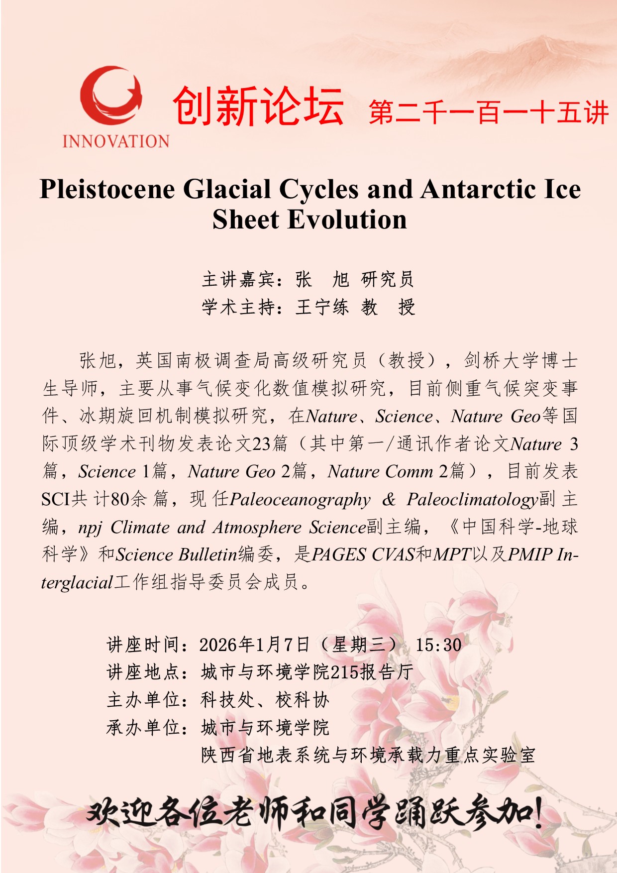 张 旭 研究员 西北大学创新论坛第二千一百一十五讲:Pleistocene Glacial Cycles and Antarctic Ice Sheet Evolution 讲座时间 2026年1月7日(星期三) 15:30 讲座地点 城市与环境学院215报告厅 讲座人介绍 张 旭 研究员 讲座内容