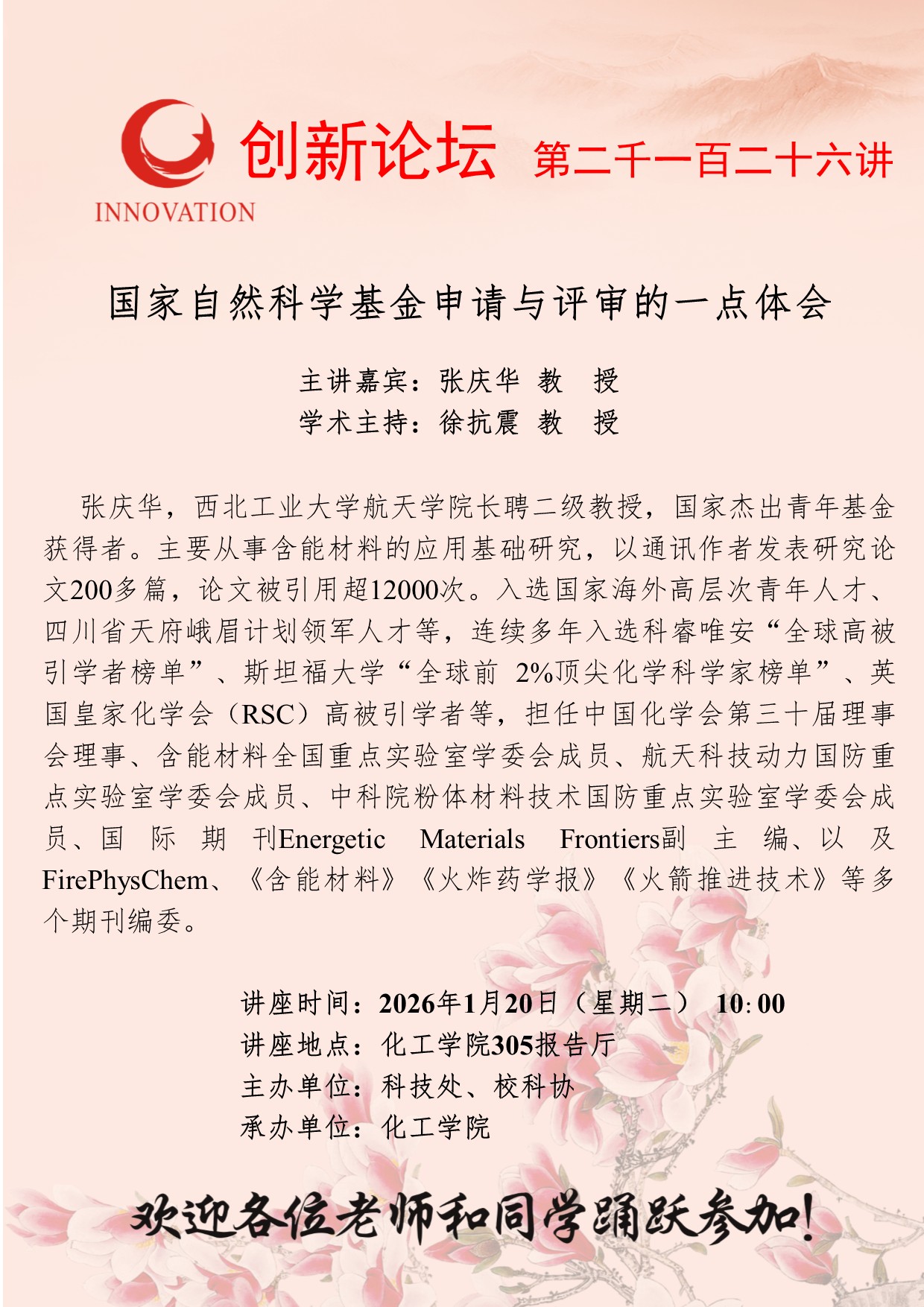 张庆华 教授 西北大学创新论坛第二千一百二十六讲:国家自然科学基金申请与评审的一点体会 讲座时间 2026年1月20日(星期二) 10:00 讲座地点 化工学院305报告厅 讲座人介绍 张庆华 教授 讲座内容