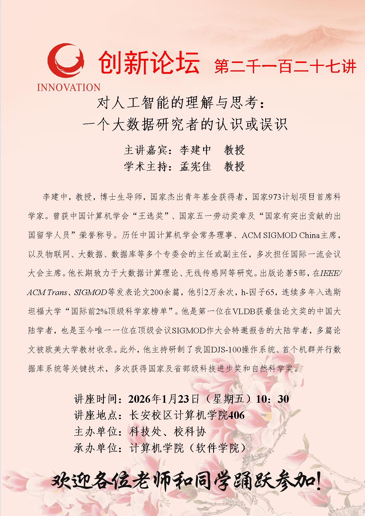 李建中 教授 西北大学创新论坛第二千一百二十七讲:对人工智能的理解与思考:一个大数据研究者的认识或误识 讲座时间 2026年1月23日(星期五)10:30 讲座地点 长安校区计算机学院406 讲座人介绍 李建中 教授 讲座内容