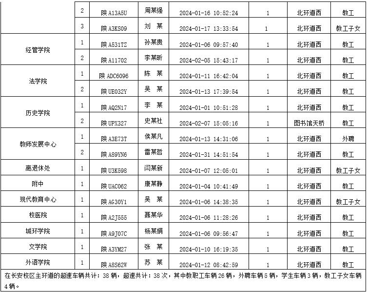 为加强校内道路交通安全管理,规范校内交通秩序,根据《西北大学校园道路交通管理办法》有关要求,现将2024年1月校园交通违章车辆予以曝光,所在单位负责对本单位违章师生员工进行交通安全教育和日常管理。