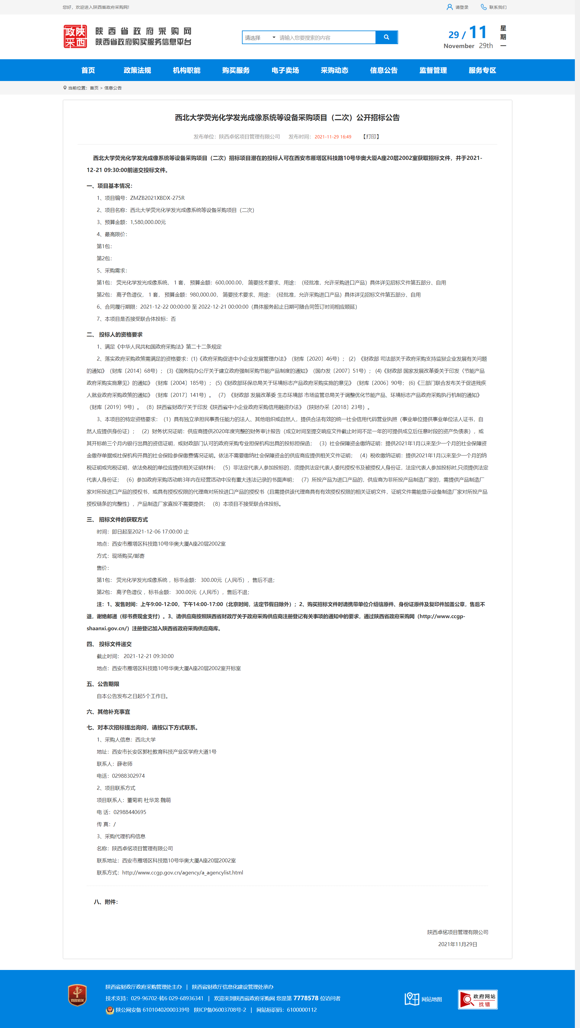 西北大学荧光化学发光成像系统等设备采购项目(二次)公开招标公告 作者: 编辑:薛利娟 时间:2021-11-29 原公告网址:http://www.ccgp-shaanxi.gov.cn/notice/noticeDetail.do?noticeguid=8a85be327d6a73bf017d6ab12dfa081d