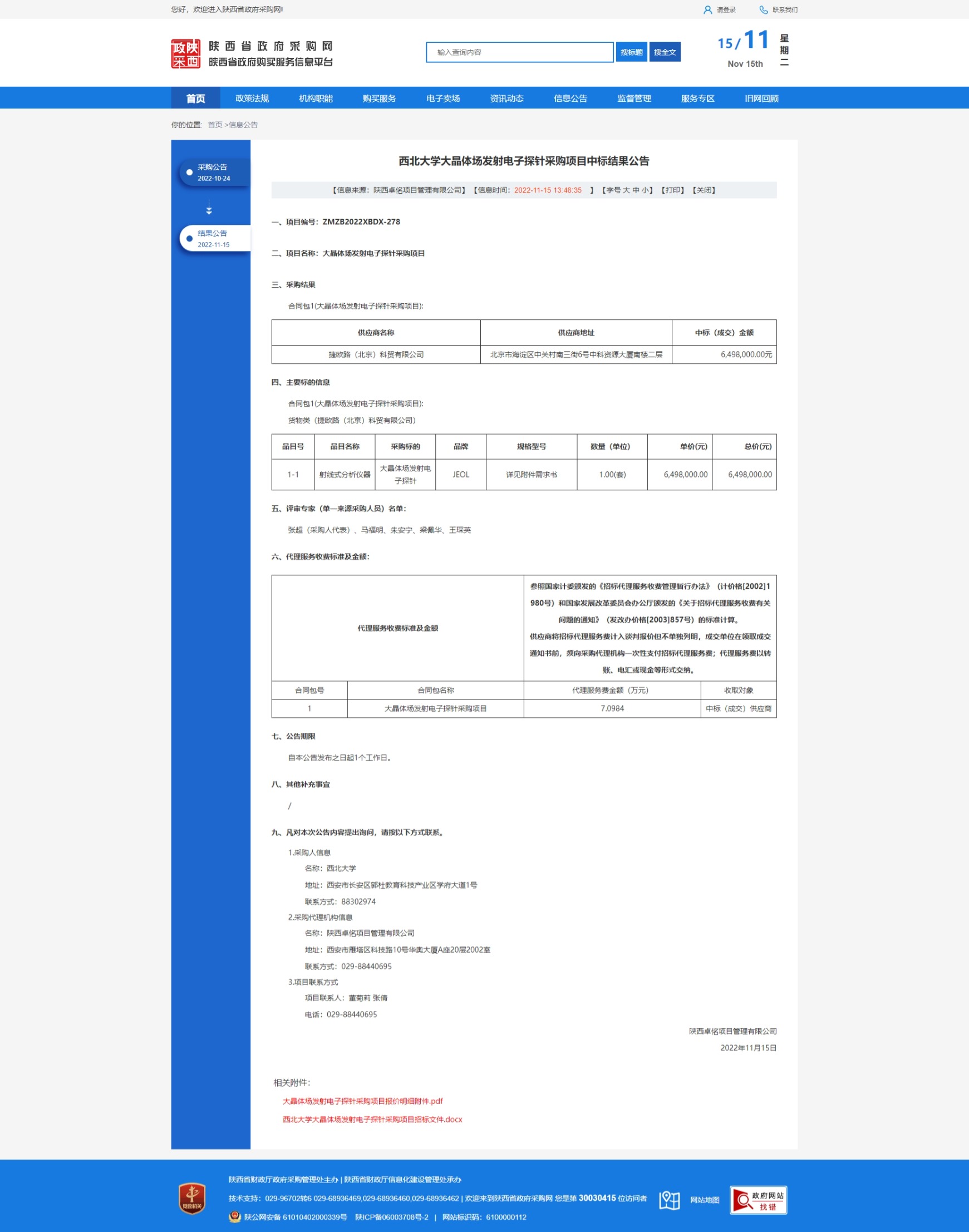 西北大学大晶体场发射电子探针采购项目中标结果公告 作者: 编辑:采购与招标办公室 时间:2022-11-15 原公告链接:http://www.ccgp-shaanxi.gov.cn/freecms/site/shaanxi/ggxx/info/2022/8a69c1948405afd90184743164664c62.html?noticeType=001021¬iceId=c98b2ee6-64a9-11ed-9a8e-08c0eb20c666