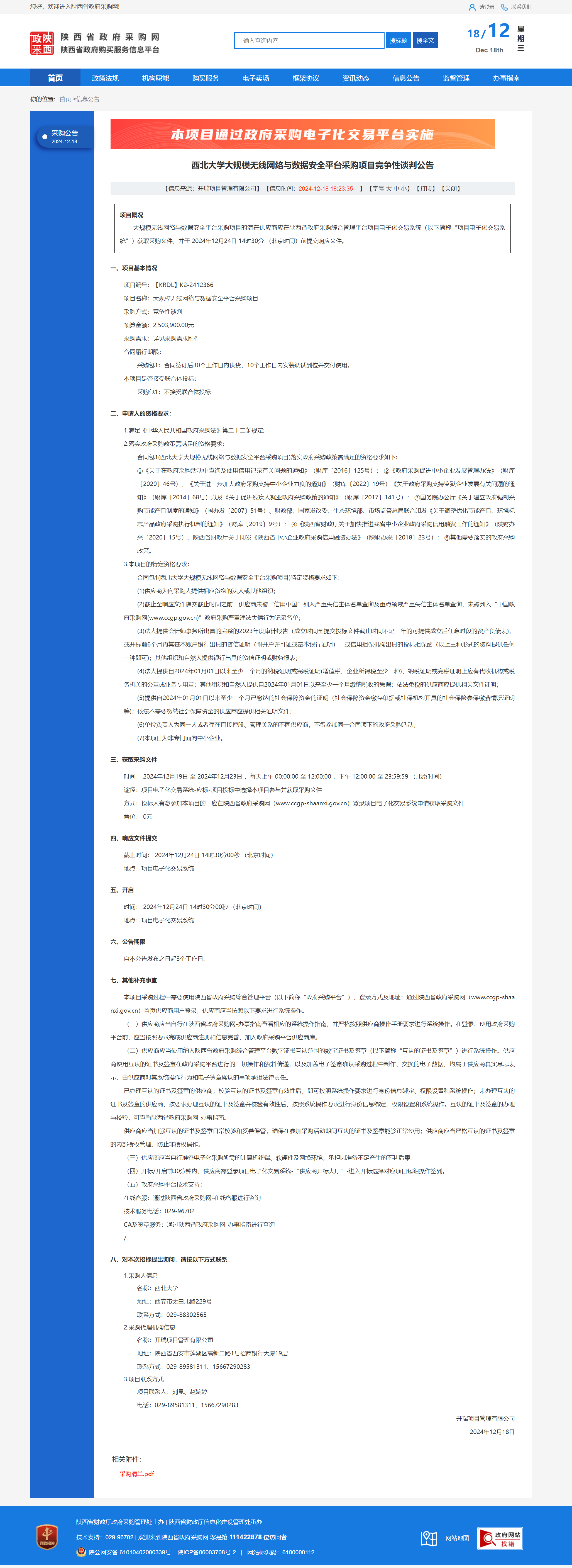 西北大学大规模无线网络与数据安全平台采购项目竞争性谈判公告