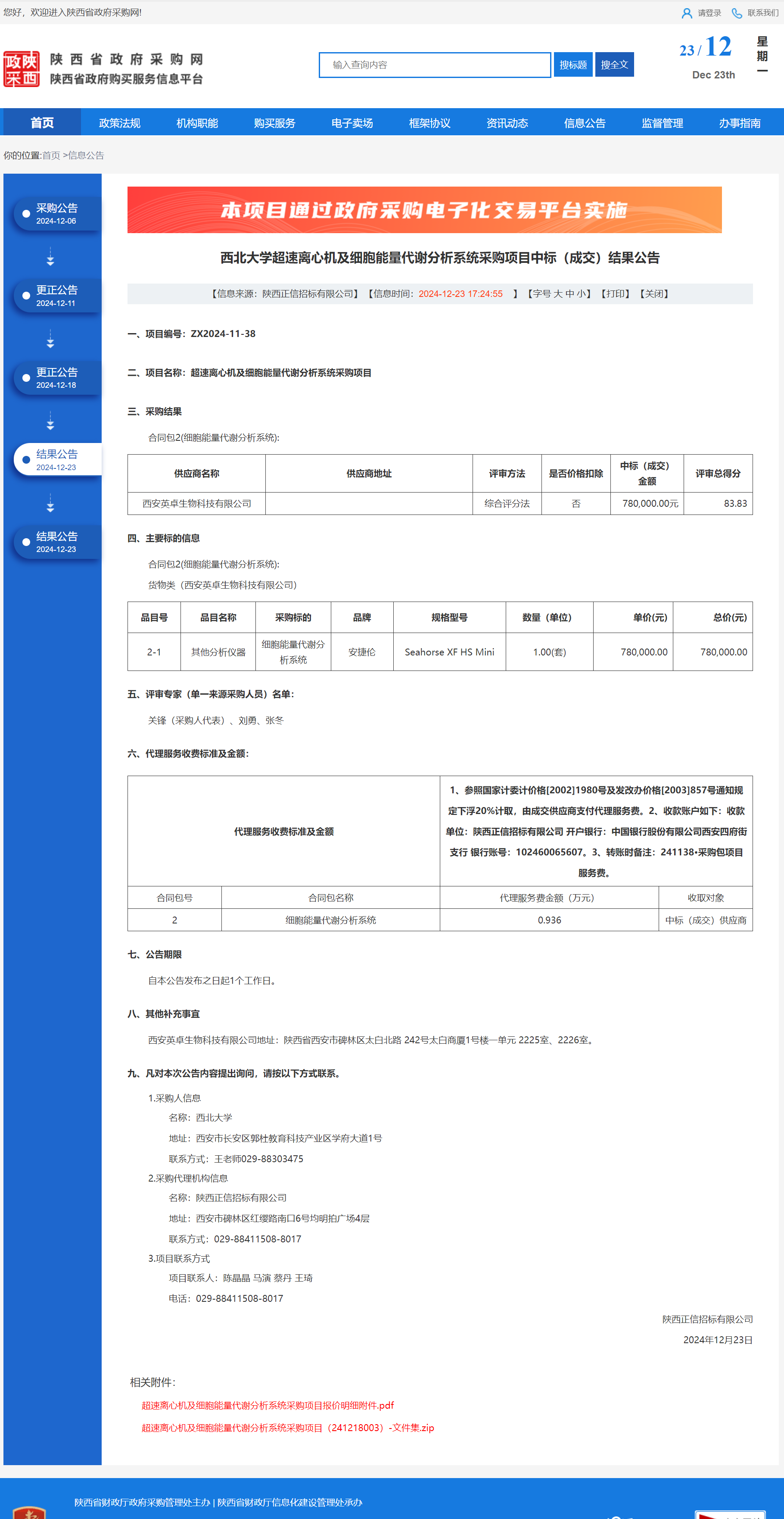 西北大学超速离心机及细胞能量代谢分析系统采购项目中标(成交)结果公告 作者:采购与招标办公室 编辑: 时间:2024-12-23 原公告链接:https://www.ccgp-shaanxi.gov.cn/freecms/site/shaanxi/ggxx/info/2024/8a69c5a59218576d0193f2aecd2071b1.html?noticeType=001026¬iceId=699edded-c111-11ef-8063-08c0eb20c666