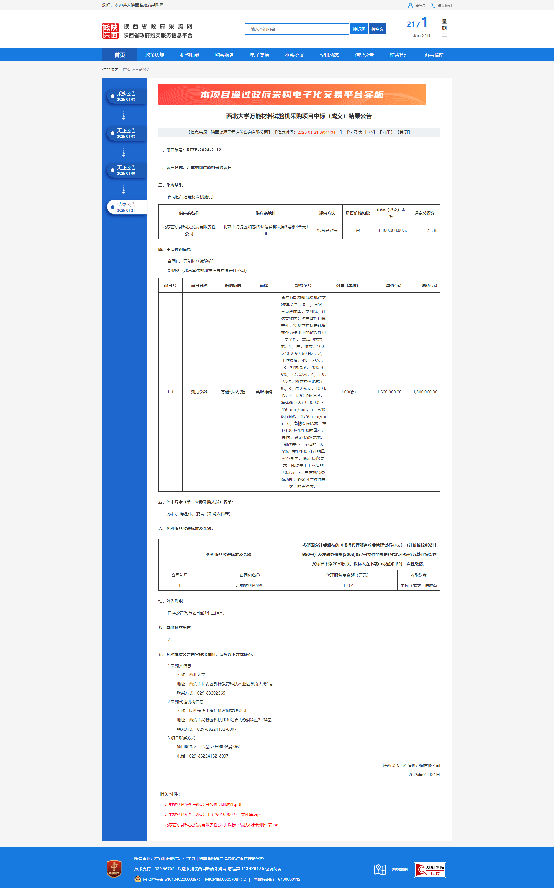 西北大学万能材料试验机采购项目中标(成交)结果公告