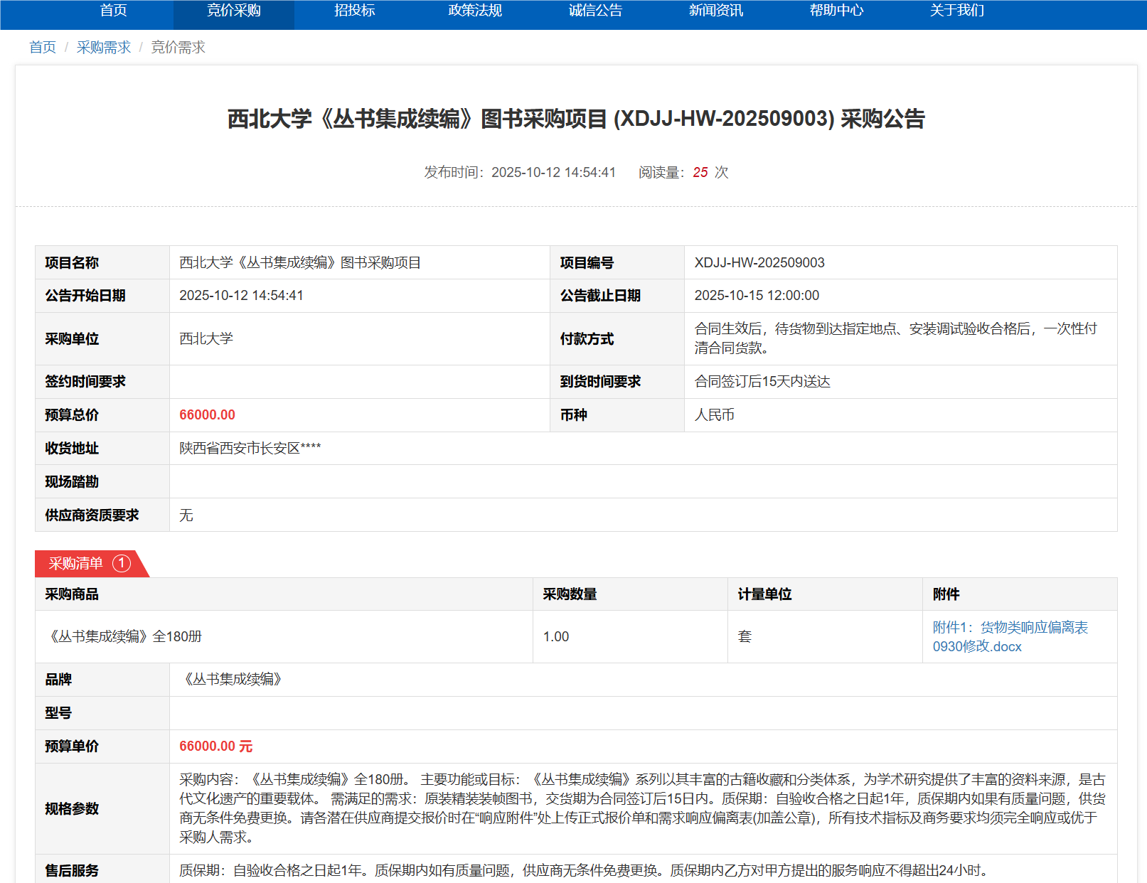 西北大学锅炉排放污染物指标监测服务采购项目(XDJJ-FW-202509002)竞价采购公告