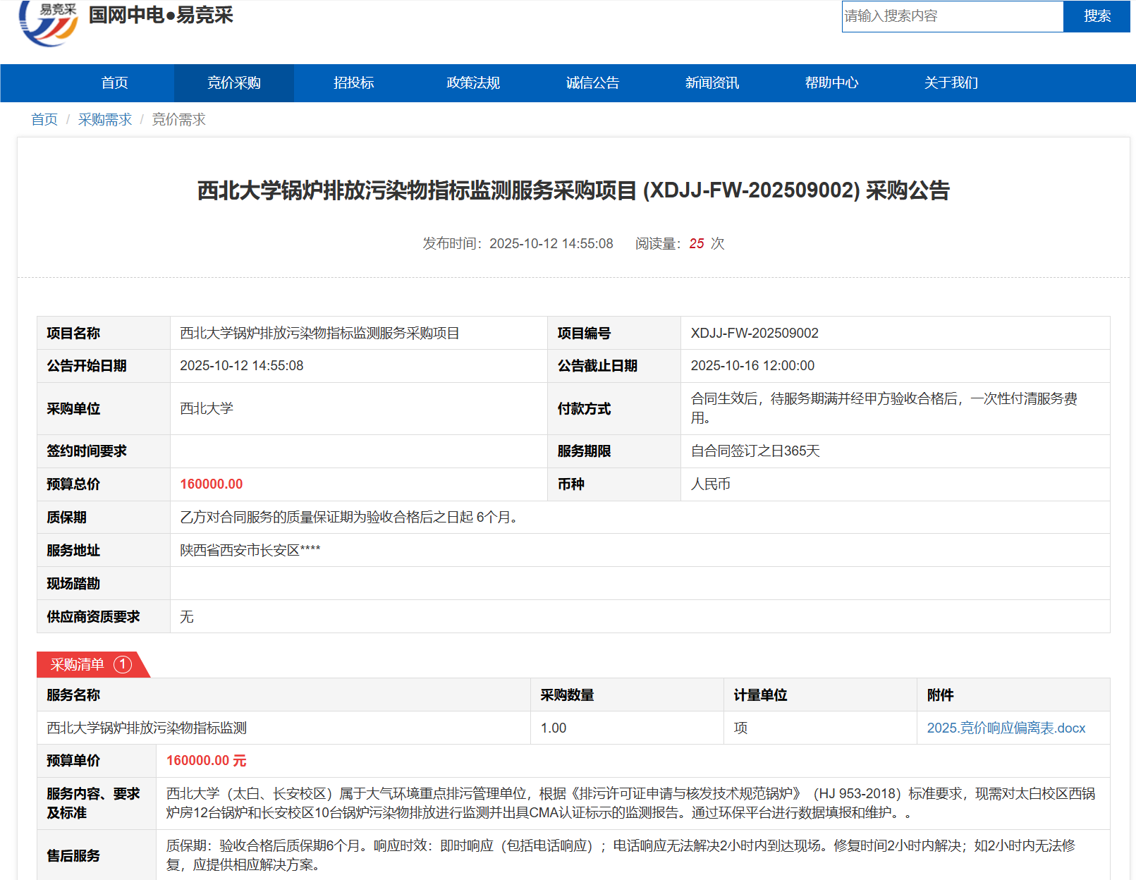 西北大学锅炉排放污染物指标监测服务采购项目(XDJJ-FW-202509002)竞价采购公告