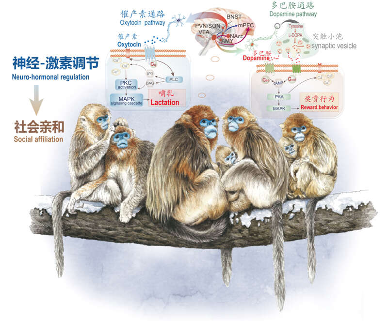 团队发现:在哺乳动物中,催产素和多巴胺具有强化母亲与幼儿之间的纽带的作用。寒冷效应引发它们的适应性变化,强化了母婴间的纽带,延长了寒冷地区奇鼻猴的亲本抚育。同时,个体间的友好行为也得到促进,进而推动了单家庭群向重层社会的聚集。这一结果,还得到了细胞功能实验和行为学实验的验证。