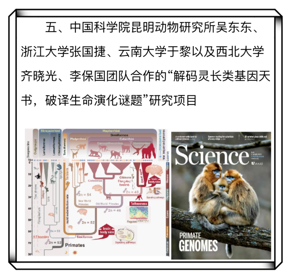 西北大学为第一单位和通讯单位的成果Adaptations to a cold climate promoted social evolution in Asian colobine primates(《寒冷适应促进了亚洲叶猴社会系统的演化》)及共同通讯单位的成果Phylogenomic analyses provide insights into primate evolution《系统基因组学研究为灵长类动物进化提供新见解》发表在Science上,作为灵长类基因组专刊的8项成果(国内4项)的内容。