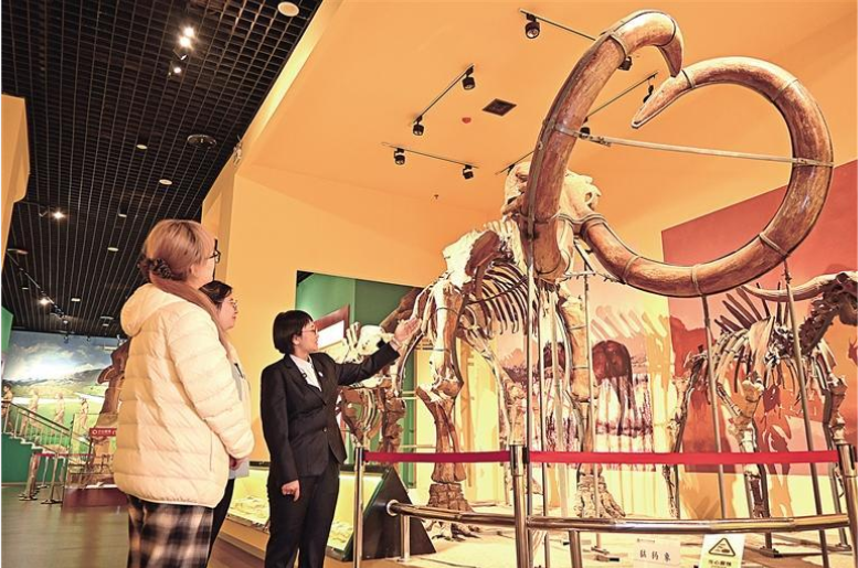 10月20日,西北大学博物馆工作人员为参观者介绍该校地质学系师生发现的猛犸象化石。