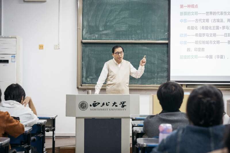 每周二傍晚,西北大学一号教学楼的一层走廊上都会热闹非凡,学生们排着长队,只为抢占一席,聆听区域国别学院黄民兴教授的大思政“金课”——《世界文明兴衰录》。