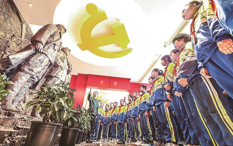 在甘肃张掖甘州区西路军烈士纪念馆(高金城烈士纪念馆)内,讲解员向学生们介绍革命先烈的故事。光明图片/视觉中国