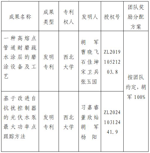 按照《西北大学促进科技成果转化实施办法》(西大科〔2019〕5号)相关规定,拟对我校化工学院胡军教授作为成果负责人2项发明专利权实施转化,现将相关信息公示如下:
