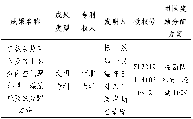 按照《西北大学促进科技成果转化实施办法》(西大科〔2019〕5号)相关规定,拟对我校化工学院杨斌教授作为成果负责人的1项发明专利权实施转化,现将相关信息公示如下:
