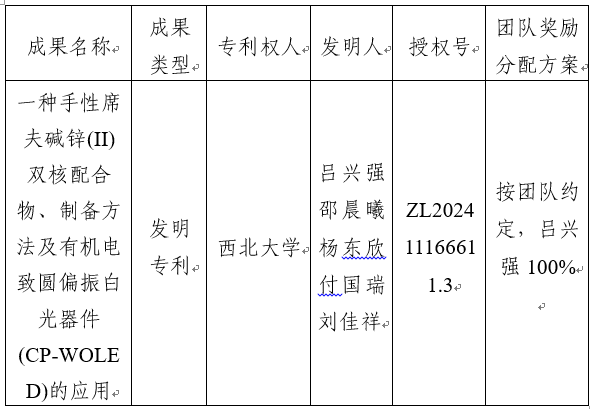按照《西北大学促进科技成果转化实施办法》(西大科〔2019〕5号)相关规定,拟对我校化工学院吕兴强教授作为成果负责人的1项专利权实施转化,现将相关信息公示如下: