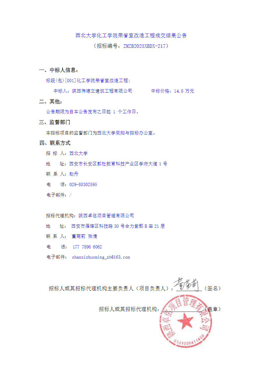 西北大学化工学院荣誉室改造工程成交结果公告