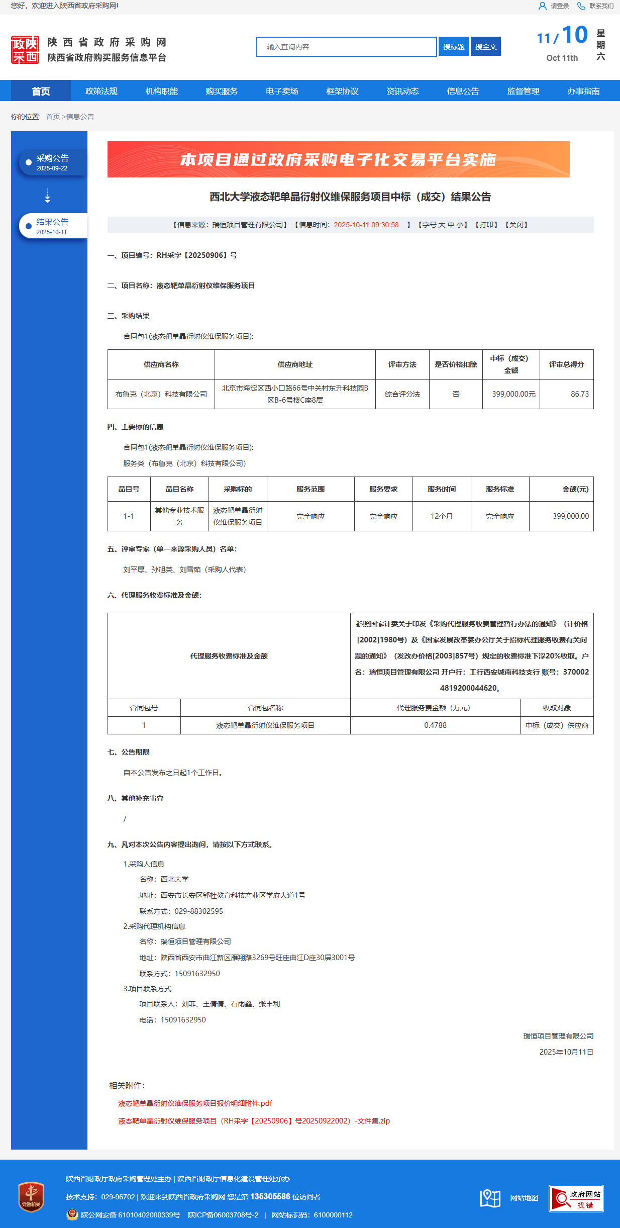 西北大学液态靶单晶衍射仪维保服务项目中标(成交)结果公告