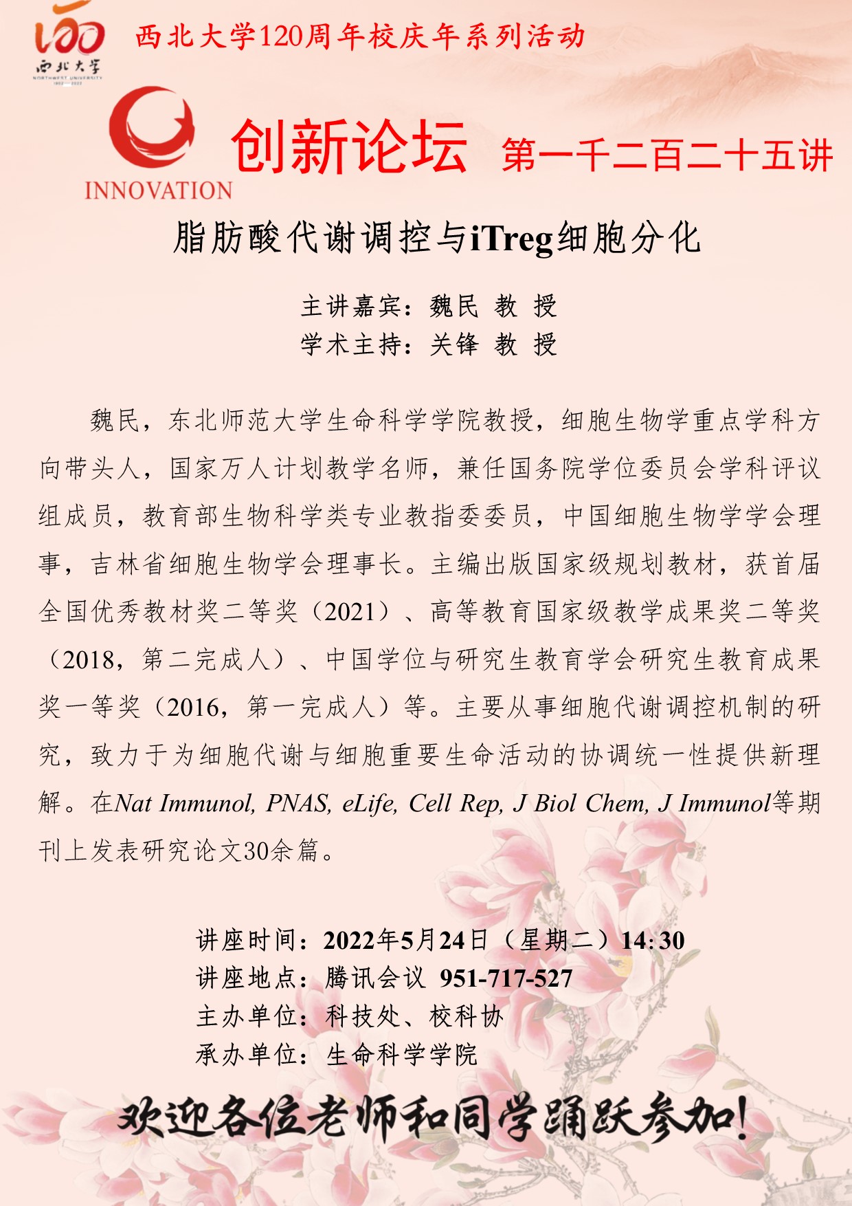 西北大学创新论坛第一千二百二十五讲暨120周年校庆年系列活动:脂肪酸代谢调控与iTreg细胞分化
