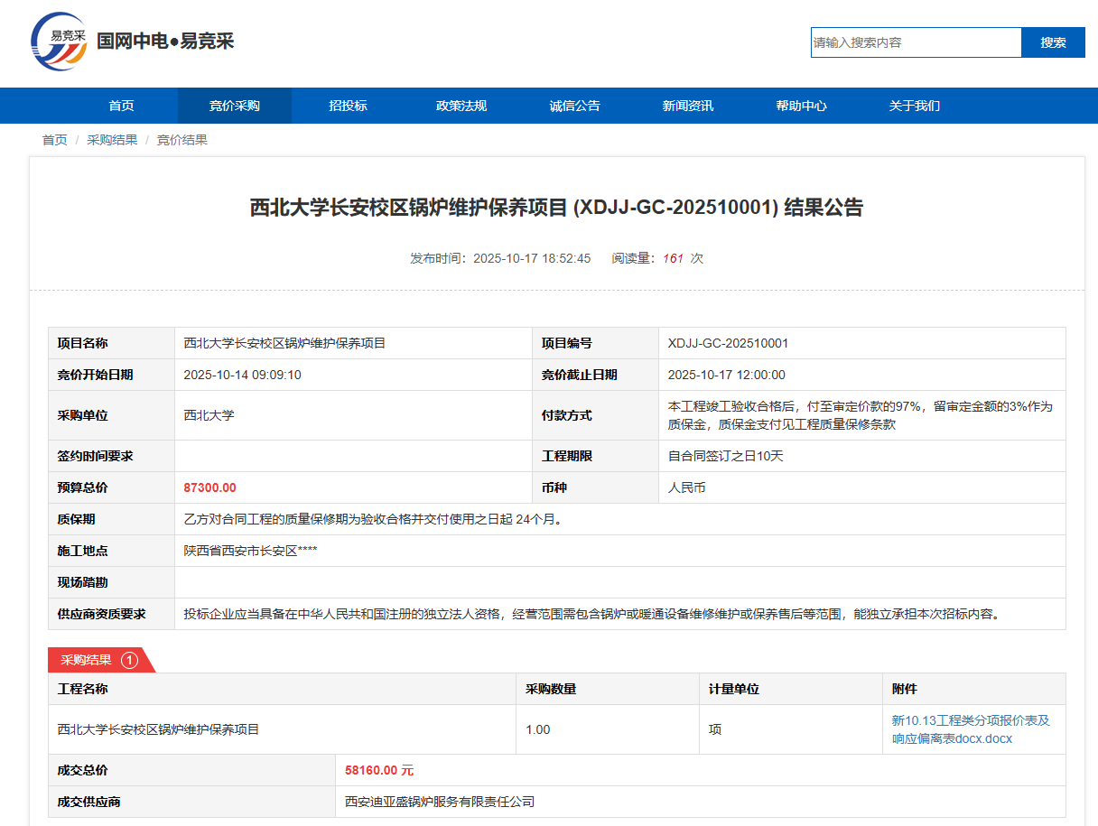西北大学长安校区锅炉维护保养项目(XDJJ-GC-202510001)竞价结果公告