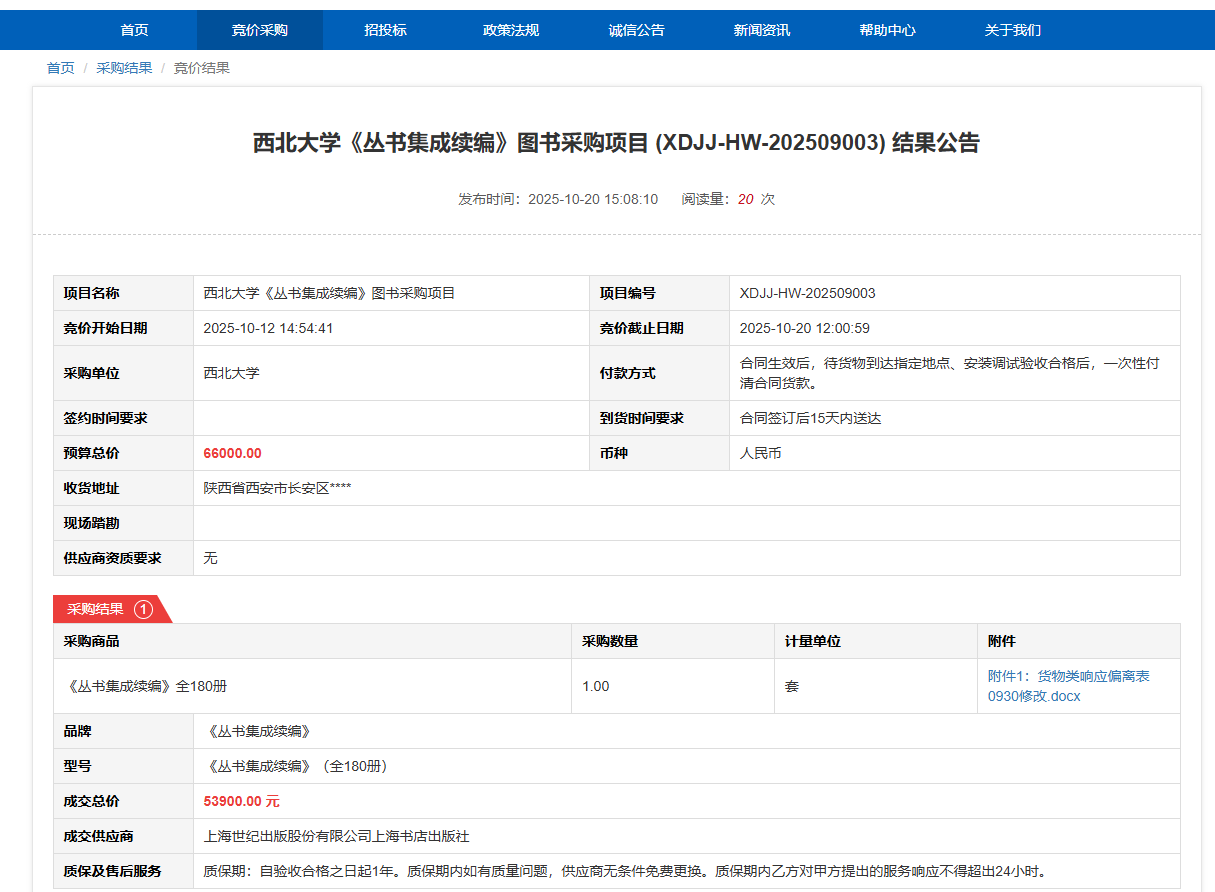西北大学《丛书集成续编》图书采购项目(XDJJ-HW-202509003)竞价结果公告