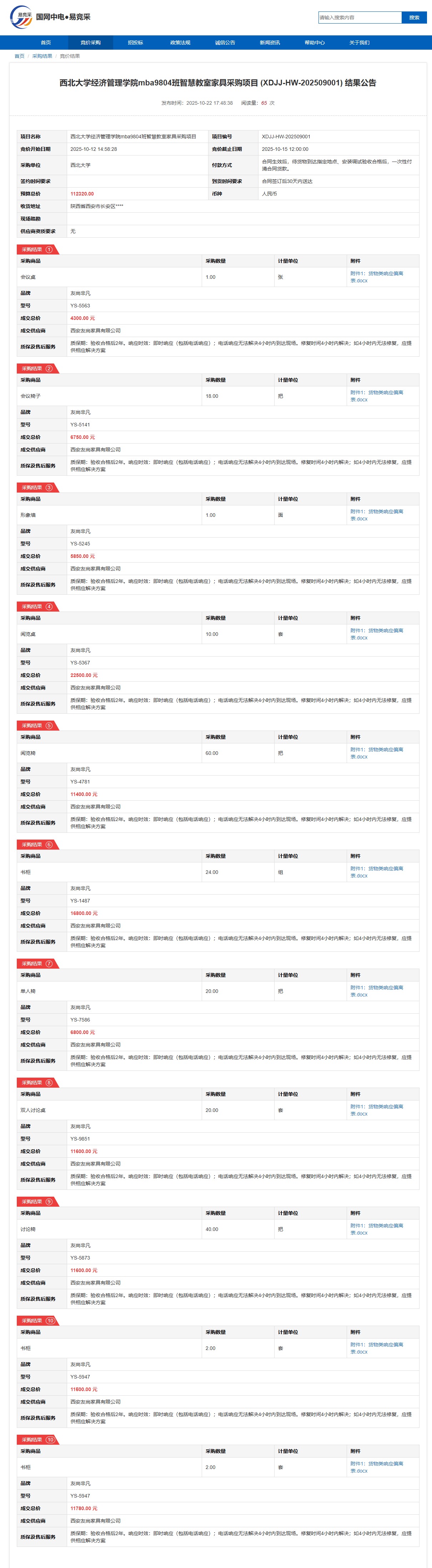 西北大学经济管理学院mba9804班智慧教室家具采购项目(XDJJ-HW-202509001)竞价结果公告
