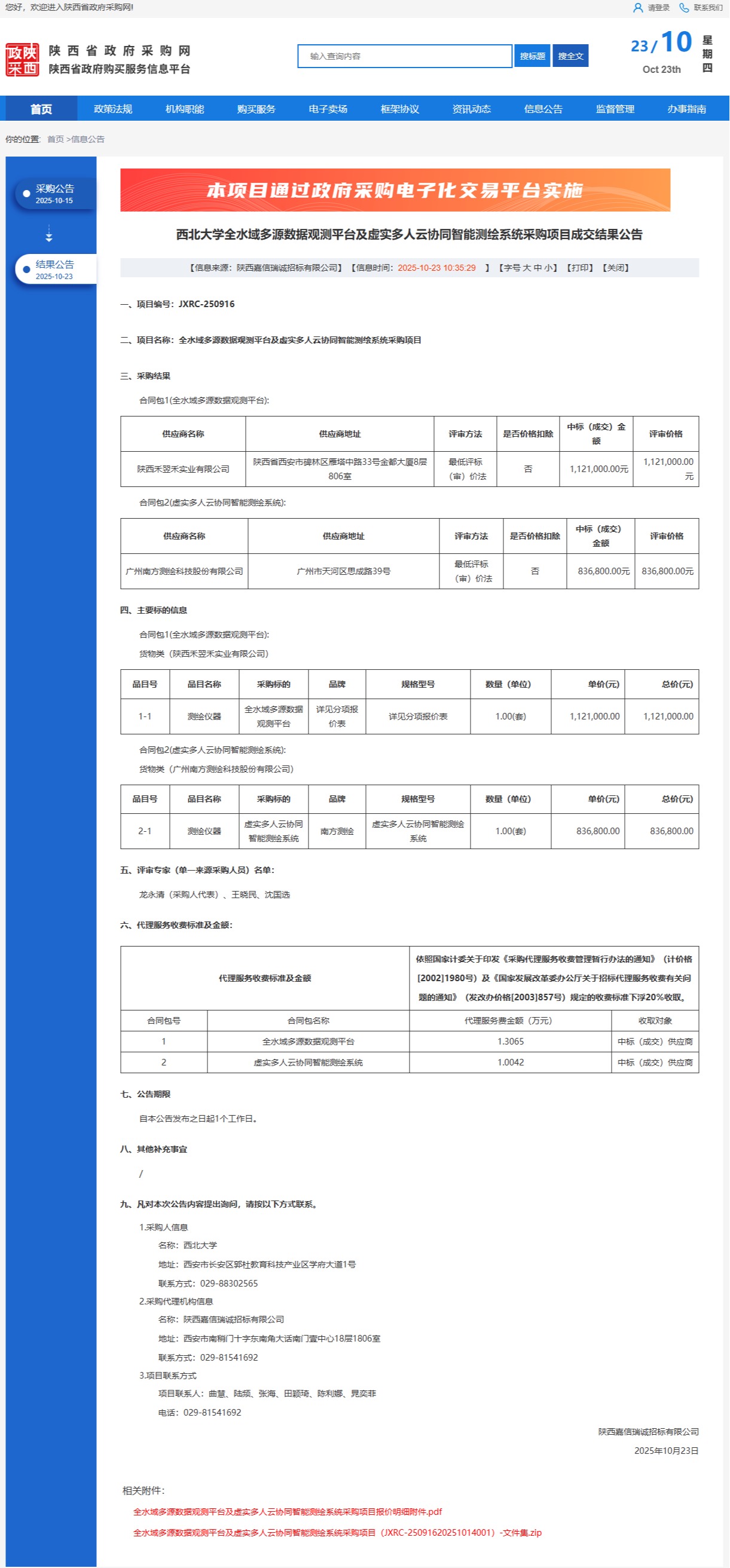 西北大学全水域多源数据观测平台及虚实多人云协同智能测绘系统采购项目成交结果公告