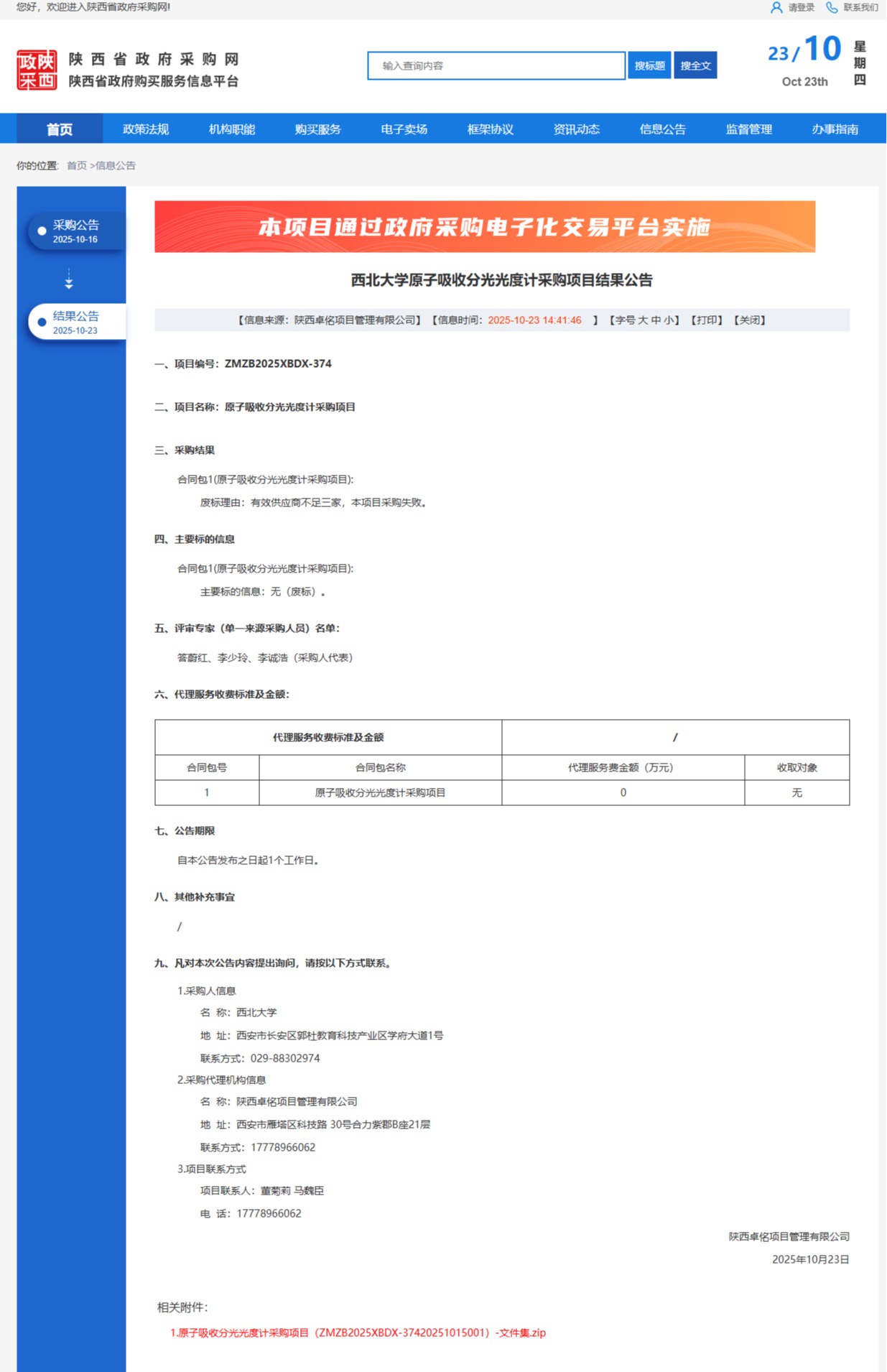 西北大学原子吸收分光光度计采购项目结果公告