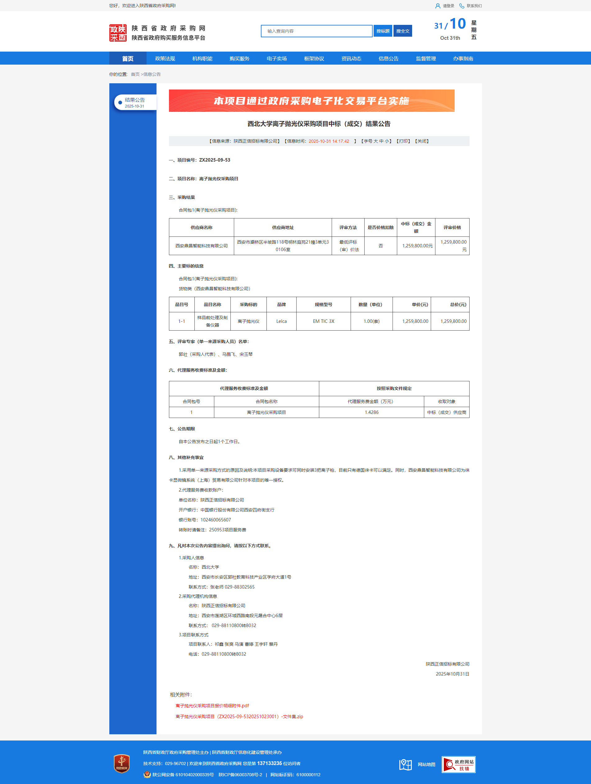 西北大学离子抛光仪采购项目中标(成交)结果公告