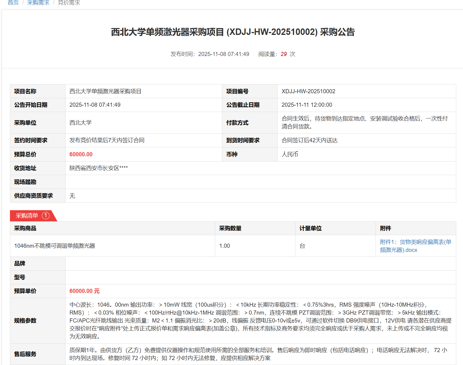 西北大学单频激光器采购项目(XDJJ-HW-202510002)竞价采购公告