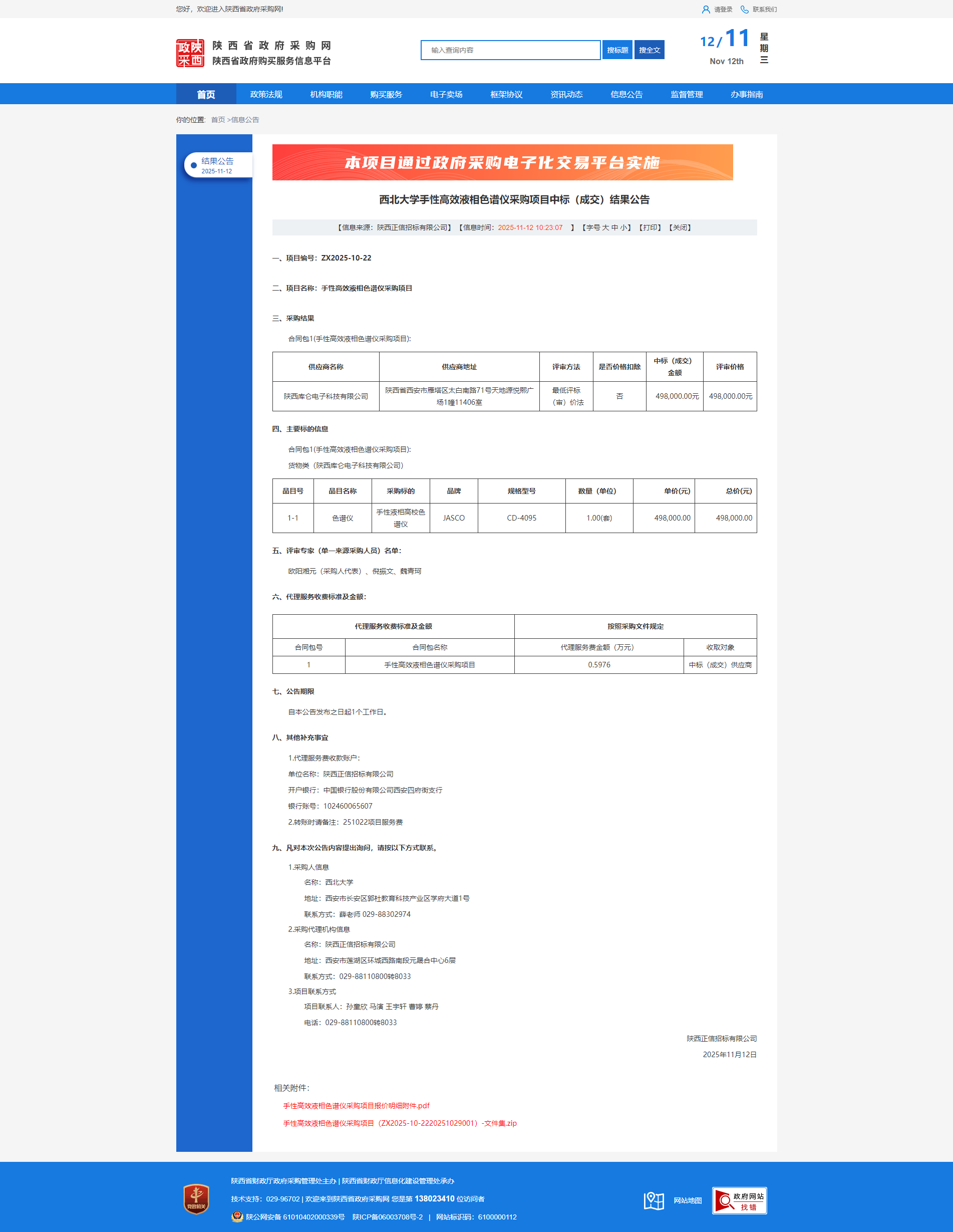 西北大学手性高效液相色谱仪采购项目中标(成交)结果公告