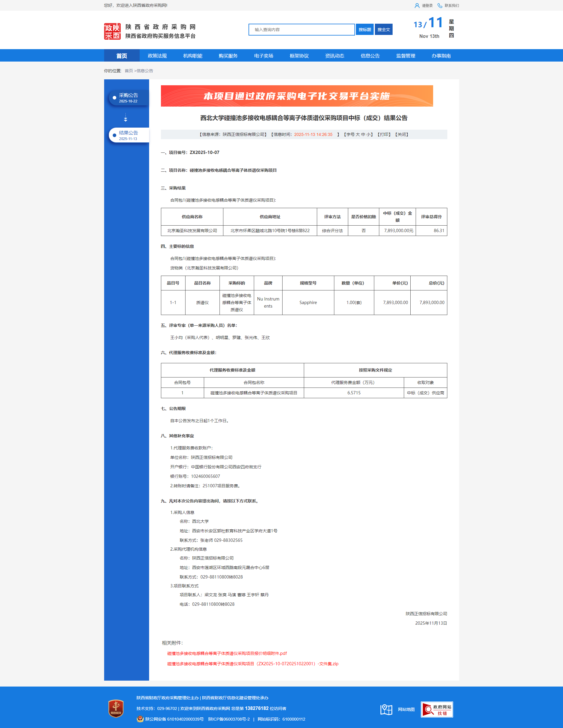 西北大学碰撞池多接收电感耦合等离子体质谱仪采购项目中标(成交)结果公告