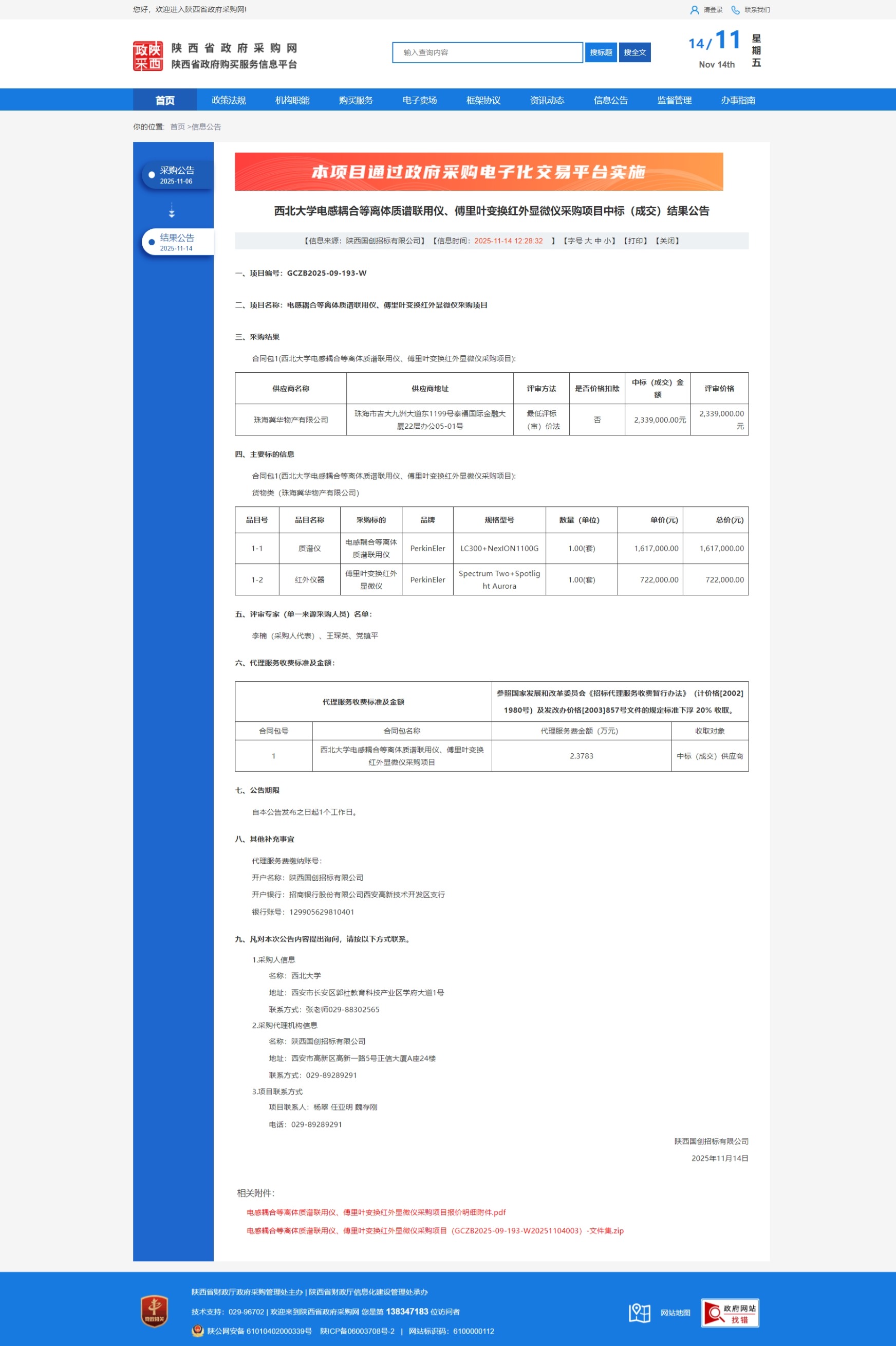 西北大学电感耦合等离体质谱联用仪、傅里叶变换红外显微仪采购项目中标(成交)结果公告 作者:国有资产管理处 编辑:国有资产管理处 时间:2025-11-14 原公告链接:https://www.ccgp-shaanxi.gov.cn/freecms/site/shaanxi/ggxx/info/2025/8a69c17b9a636c6b019a80987bf32ca5.html?noticeType=001023¬iceId=99143c43-c114-11f0-8063-08c0eb20c666