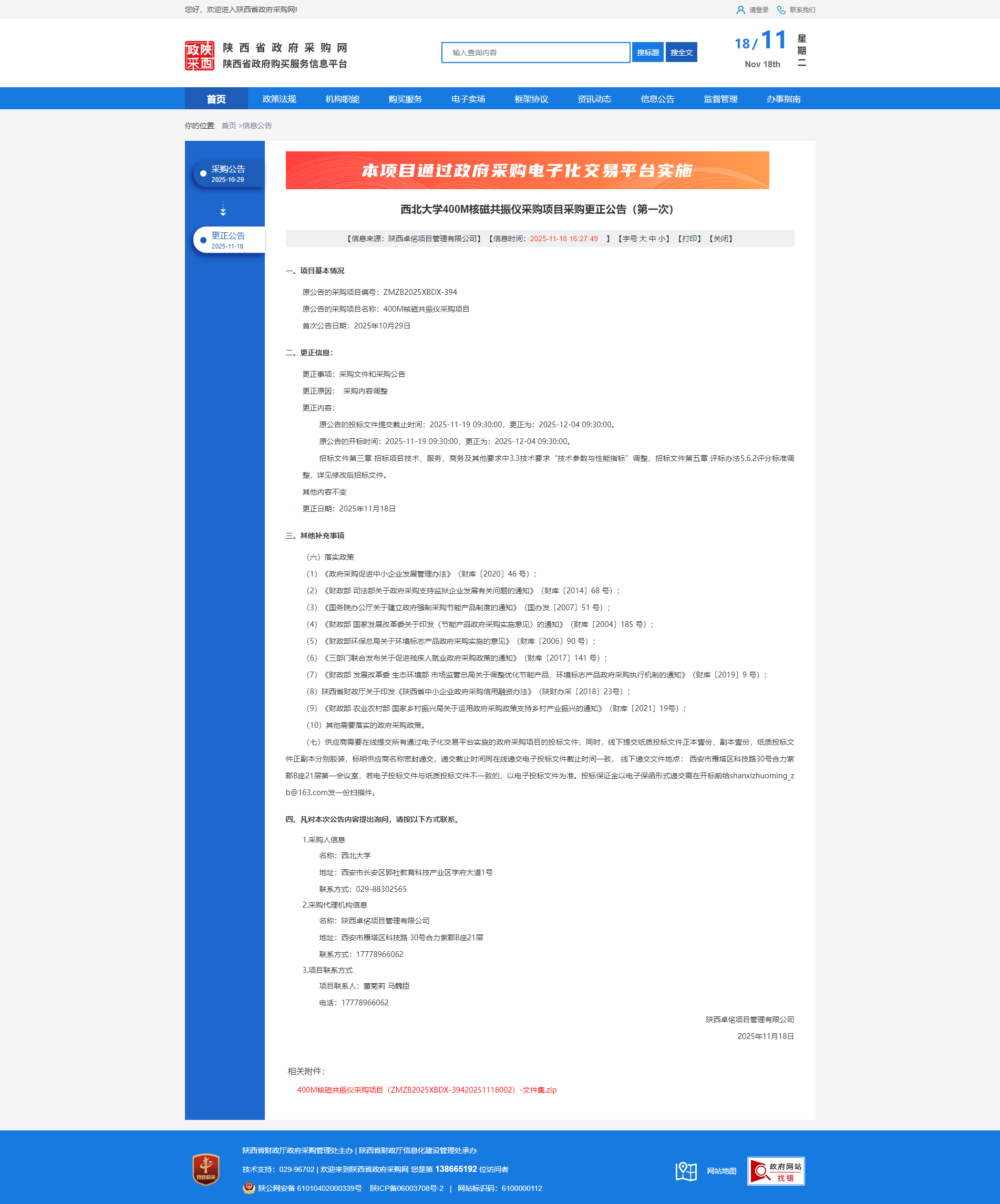 西北大学400M核磁共振仪采购项目采购更正公告(第一次)