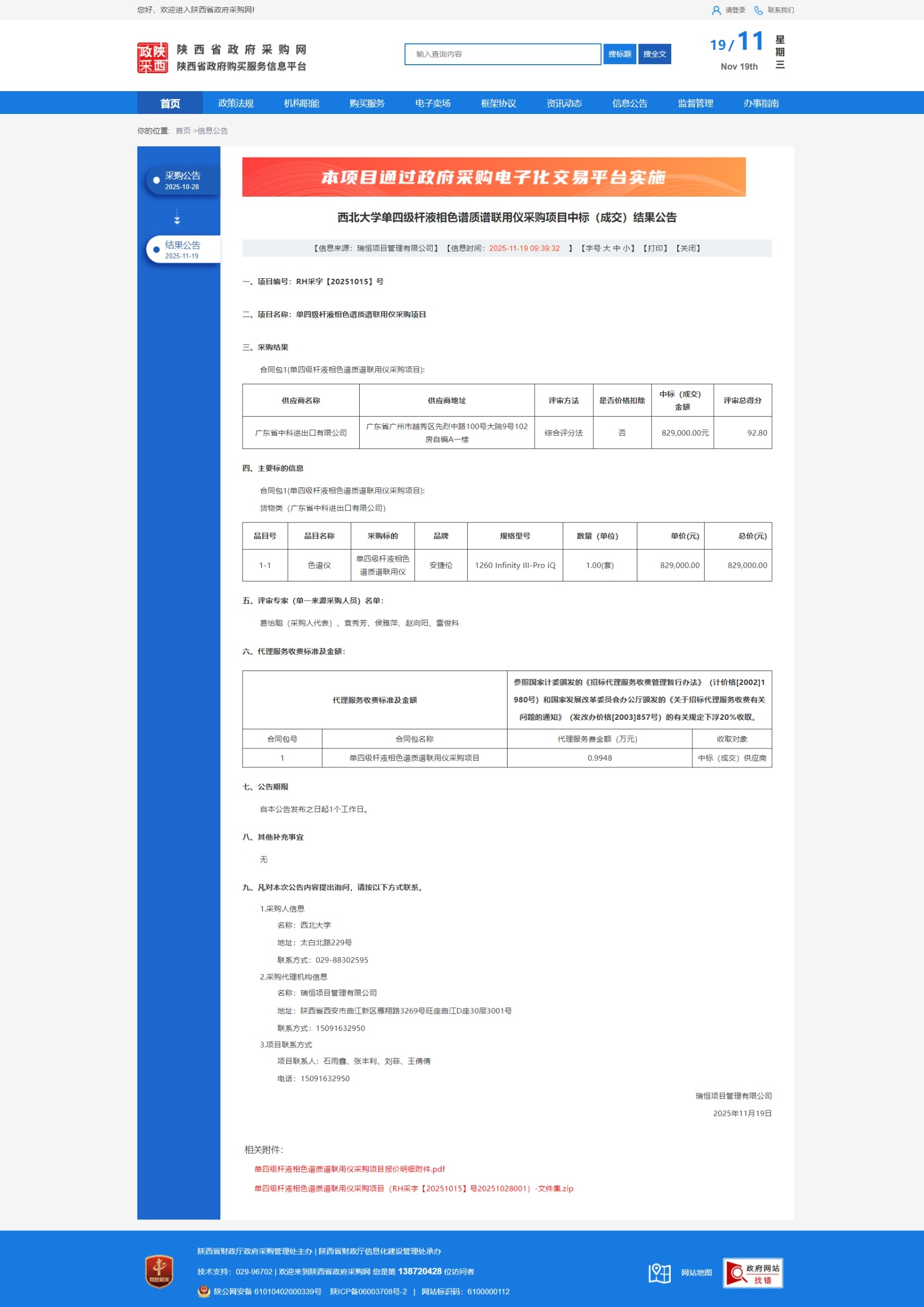西北大学单四级杆液相色谱质谱联用仪采购项目中标(成交)结果公告 作者:国有资产管理处 编辑:国有资产管理处 时间:2025-11-19 原公告链接:https://www.ccgp-shaanxi.gov.cn/freecms/site/shaanxi/ggxx/info/2025/8a69c90c9a636e68019a99a0ab1247ea.html?noticeType=001021¬iceId=d37578e5-c4ea-11f0-8063-08c0eb20c666