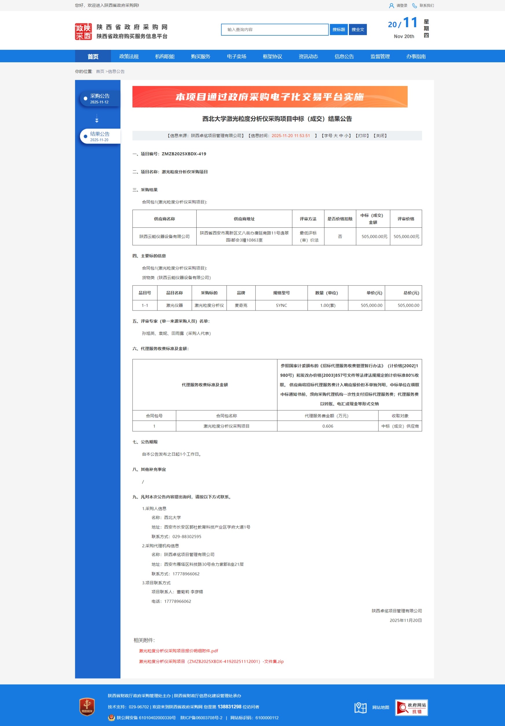 西北大学激光粒度分析仪采购项目中标(成交)结果公告 作者:国有资产管理处 编辑:国有资产管理处 时间:2025-11-20 原公告链接:https://www.ccgp-shaanxi.gov.cn/freecms/site/shaanxi/ggxx/info/2025/8a69c5539a636e42019a9f5c85c63e62.html?noticeType=001023¬iceId=c1e65fb5-c5c6-11f0-8063-08c0eb20c666