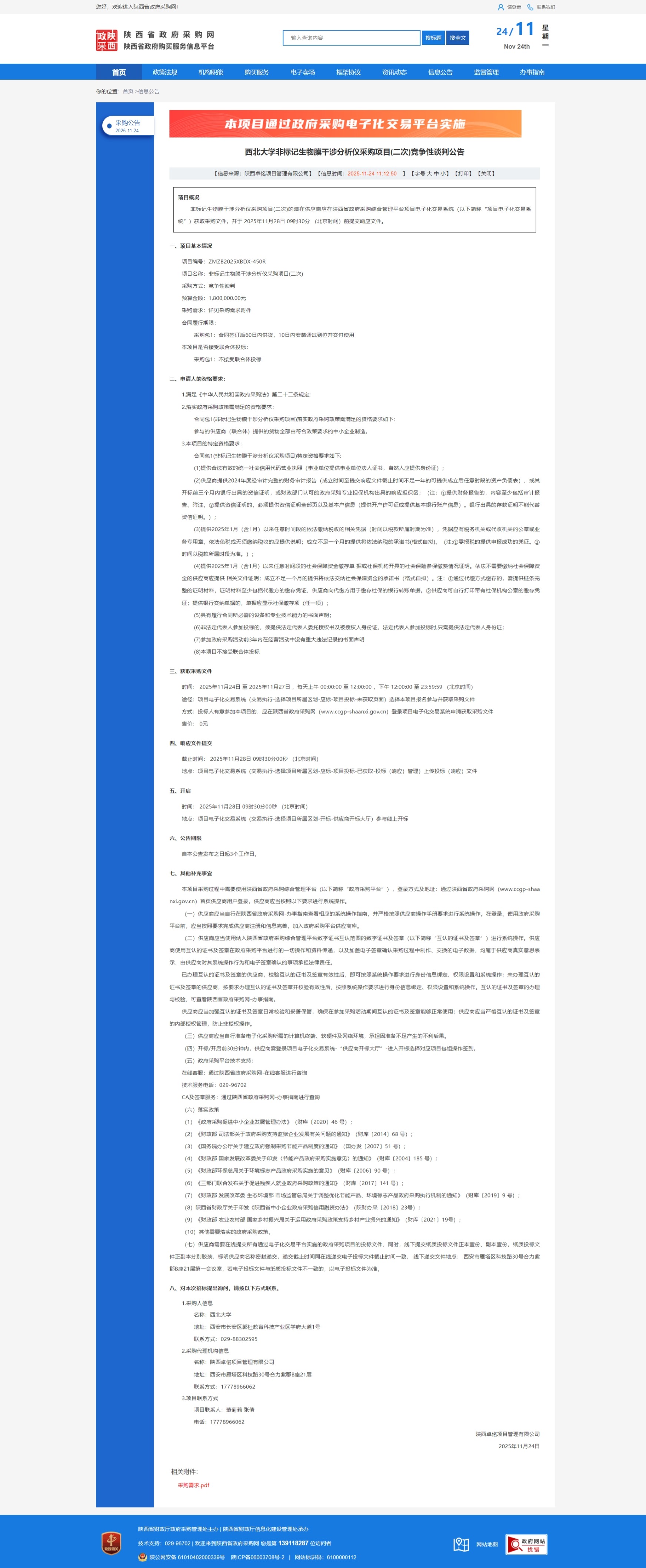 西北大学非标记生物膜干涉分析仪采购项目(二次)竞争性谈判公告 作者: 编辑:国有资产管理处 时间:2025-11-24 原公告链接:https://www.ccgp-shaanxi.gov.cn/freecms/site/shaanxi/ggxx/info/2025/8a69c5539a636e42019ab3afd37915be.html?noticeType=001013¬iceId=b2c05b7d-c8e5-11f0-8063-08c0eb20c666