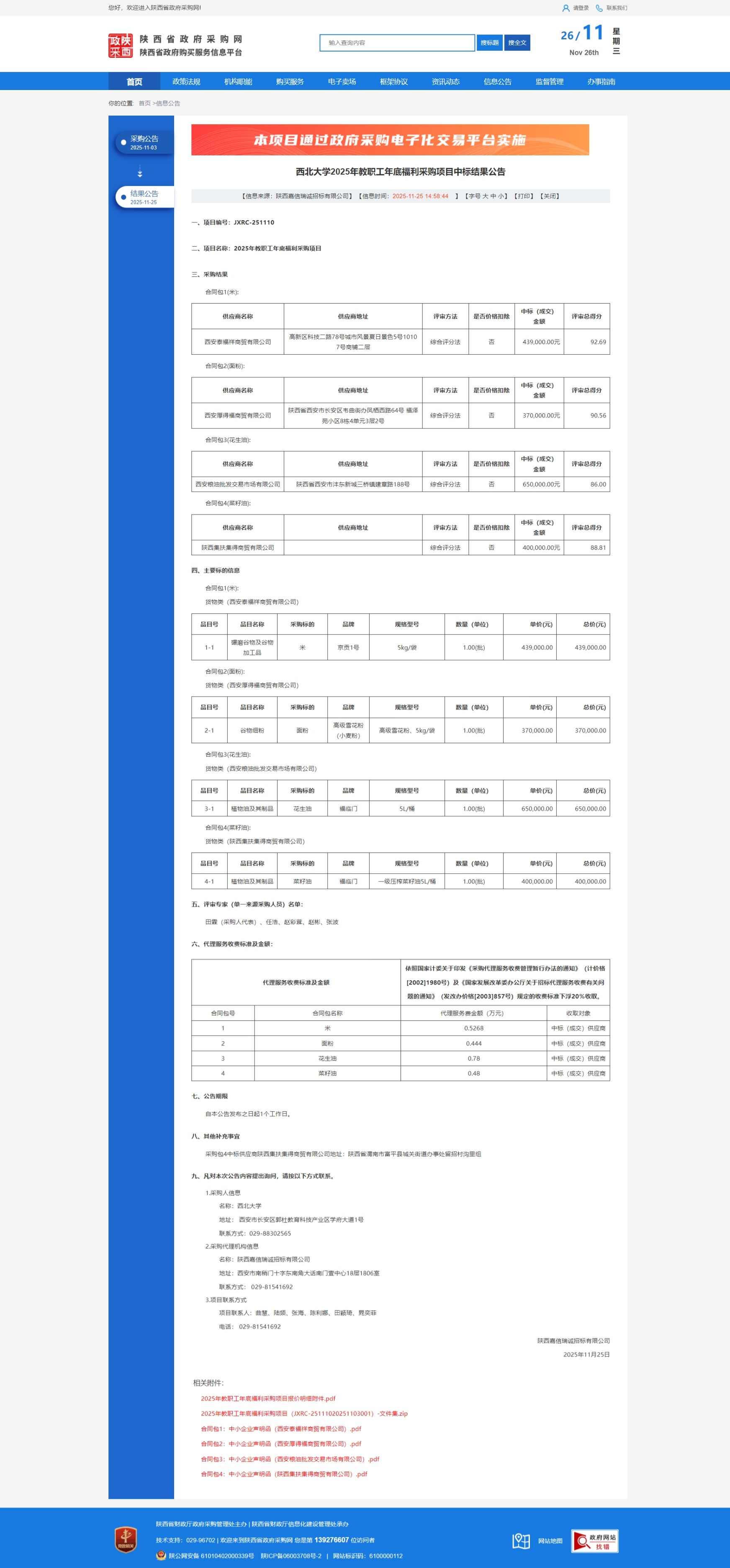 西北大学2025年教职工年底福利采购项目中标结果公告 作者: 编辑:国有资产管理处 时间:2025-11-26 原公告链接:https://www.ccgp-shaanxi.gov.cn/freecms/site/shaanxi/ggxx/info/2025/8a69c90c9a9ae48e019ab9102509472a.html?noticeType=001021¬iceId=6c90360a-c9ce-11f0-8063-08c0eb20c666