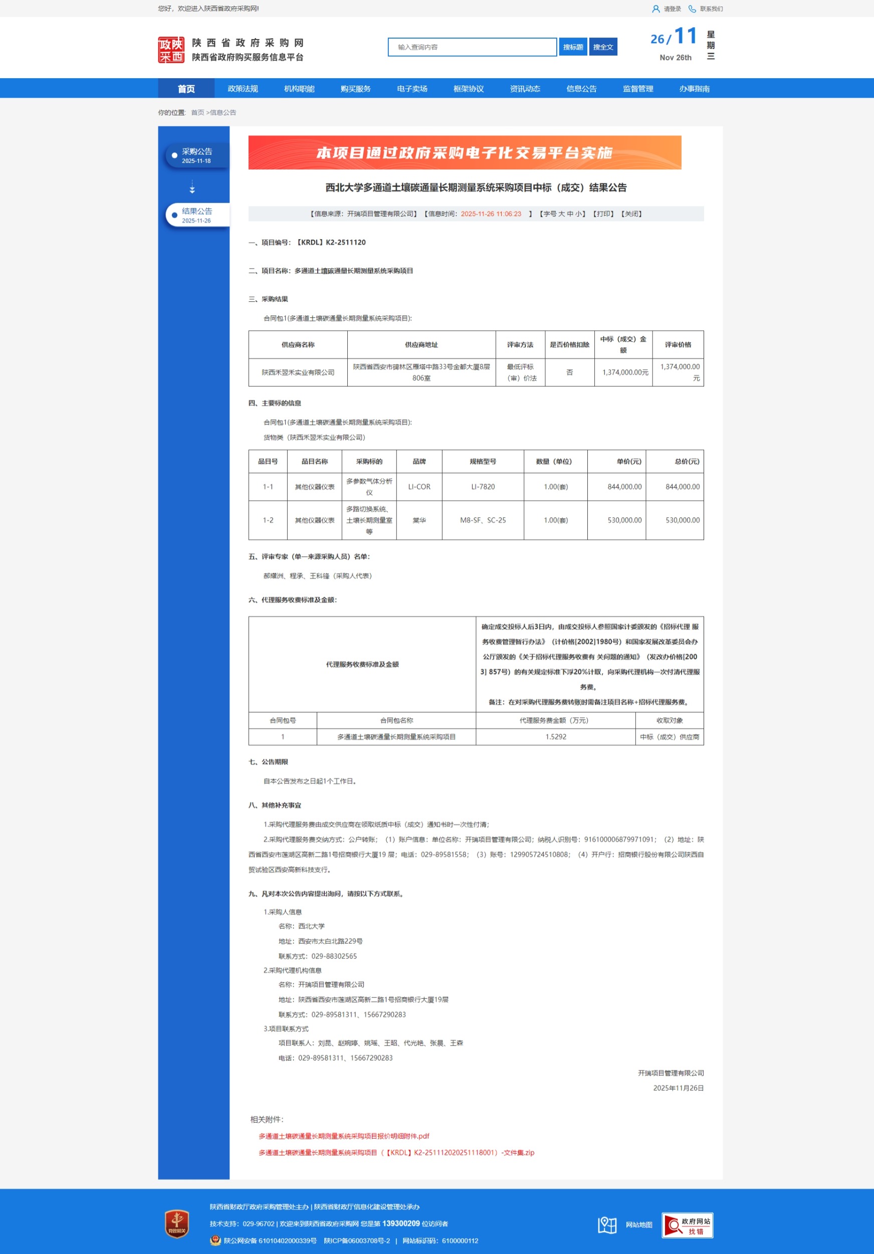 西北大学多通道土壤碳通量长期测量系统采购项目中标(成交)结果公告 作者: 编辑:国有资产管理处 时间:2025-11-26 原公告链接:https://www.ccgp-shaanxi.gov.cn/freecms/site/shaanxi/ggxx/info/2025/8a69c6d09a636c6c019abdc987856a03.html?noticeType=001023¬iceId=21b0d48e-ca77-11f0-8063-08c0eb20c666