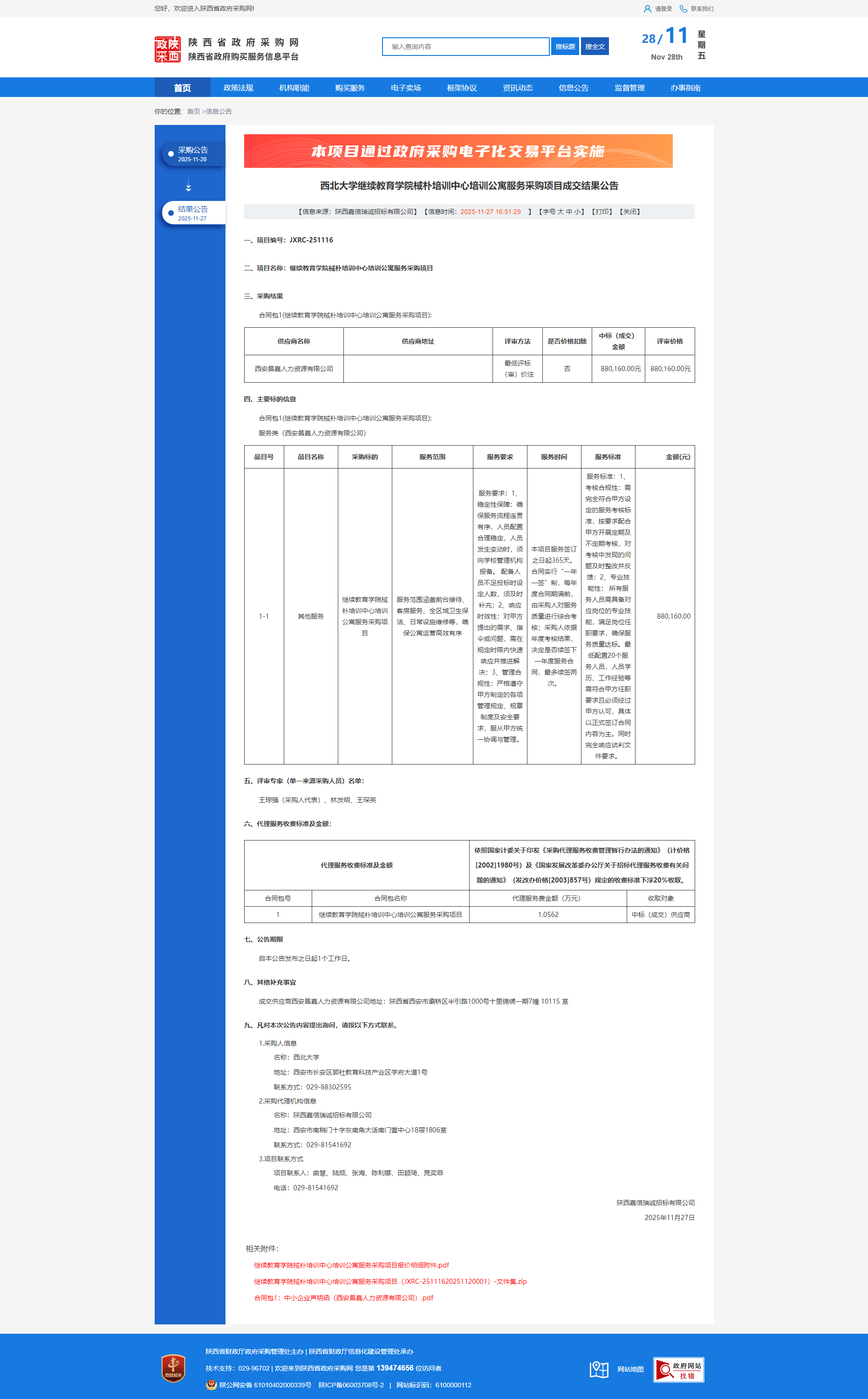 西北大学继续教育学院棫朴培训中心培训公寓服务采购项目成交结果公告